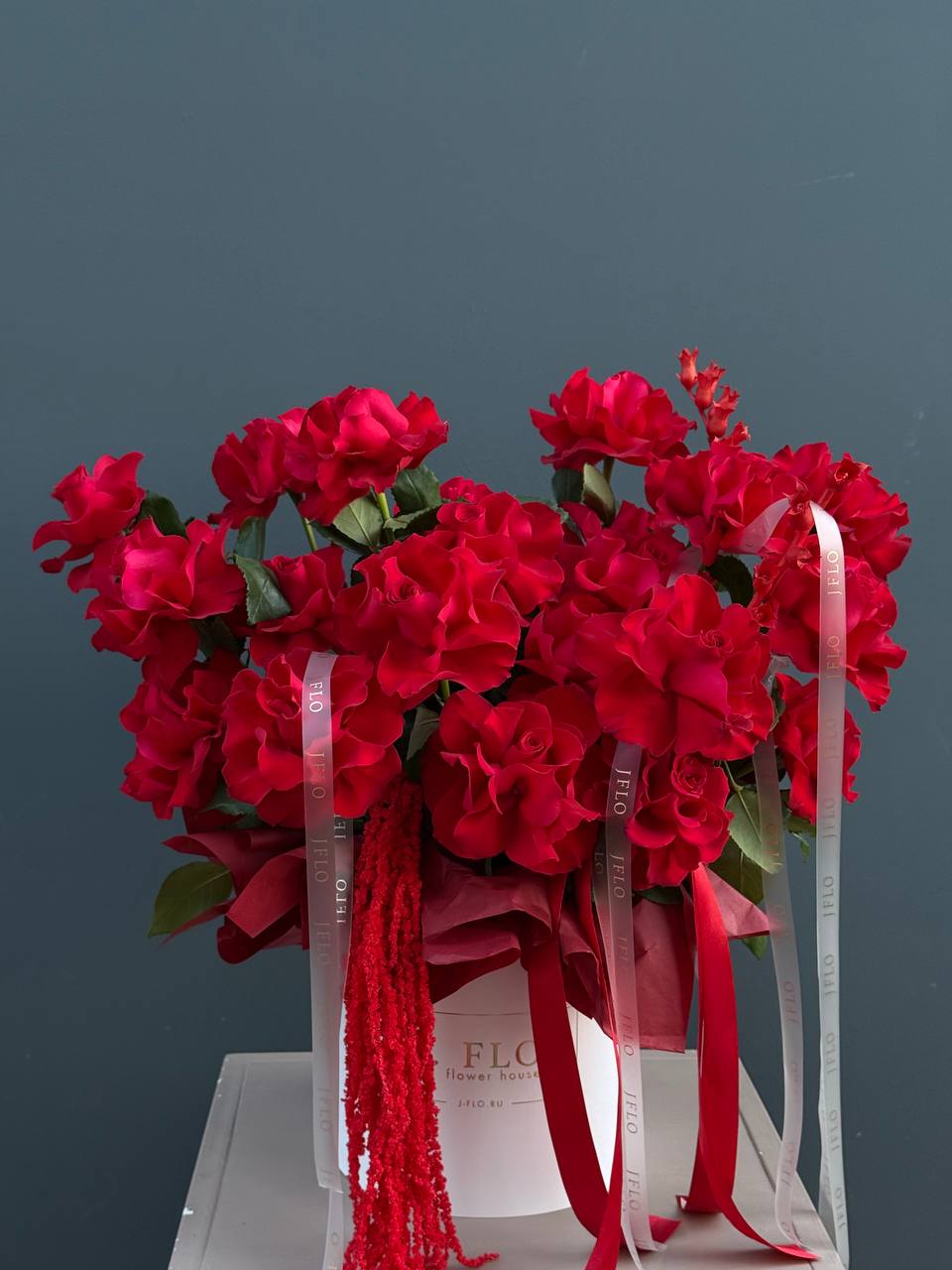 Двадцать одна роза глубокого красного оттенка собрана в плотную композицию с бордовым амарантом и натуральными сухоцветами. Насыщенность цвета создает выразительный образ, а округлая коробка сохраняет форму и свежесть бутонов надолго.