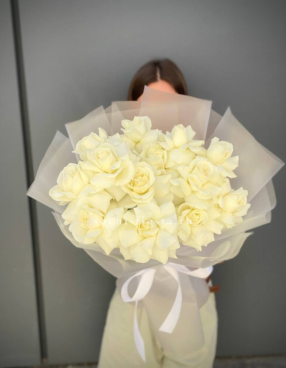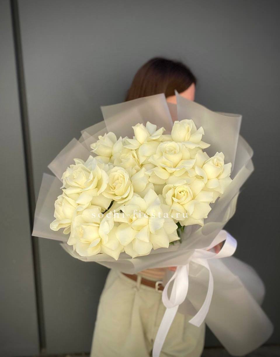 Тридцать пять белых роз образуют объемную композицию с выразительным силуэтом. Светлая упаковка поддерживает воздушность и графичность линий.