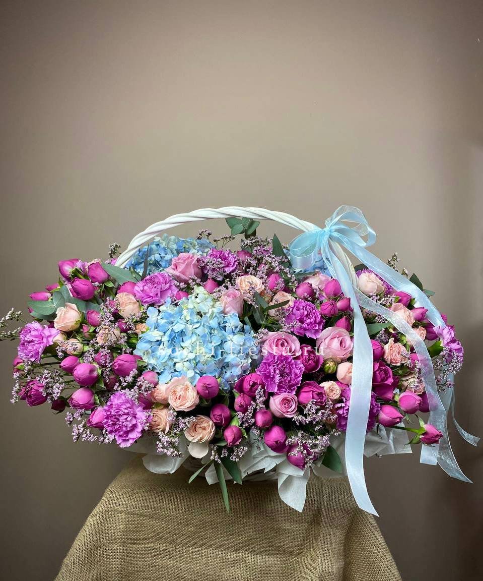 Корзина в лавандовых тонах объединяет пышные соцветия гортензии, кустовые и классические розы с воздушным лимониумом. Эвкалипт добавляет графику и свежесть всей композиции.