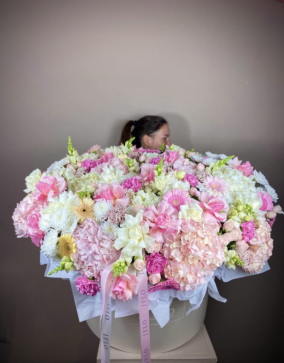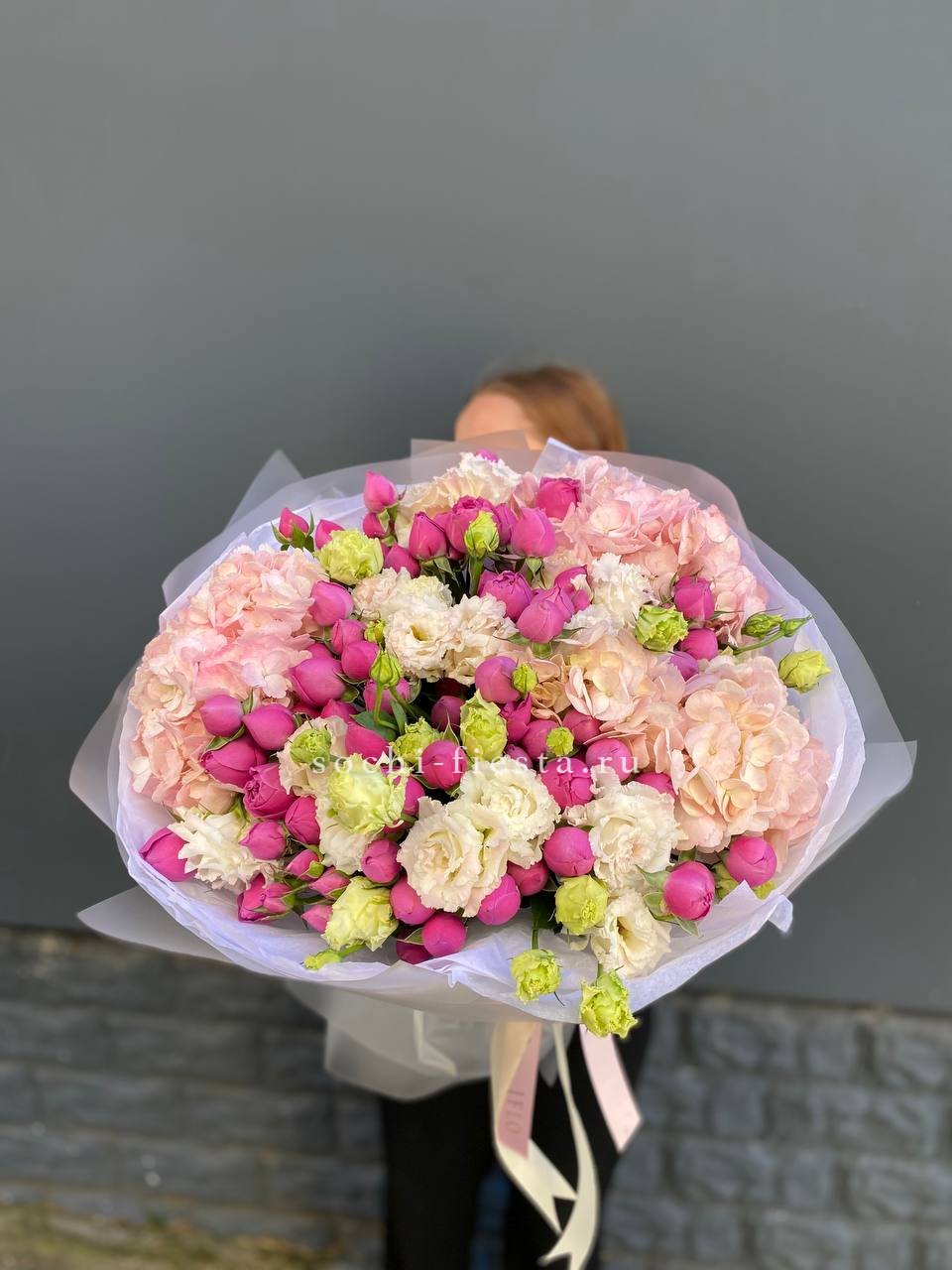 Пышная композиция с насыщенным цветением и многослойной глубиной. Пионовидные формы переплетаются с воздушной эустомой, создавая объём и плавный переход от центра к краям. Каждый бутон раскрыт по-своему.