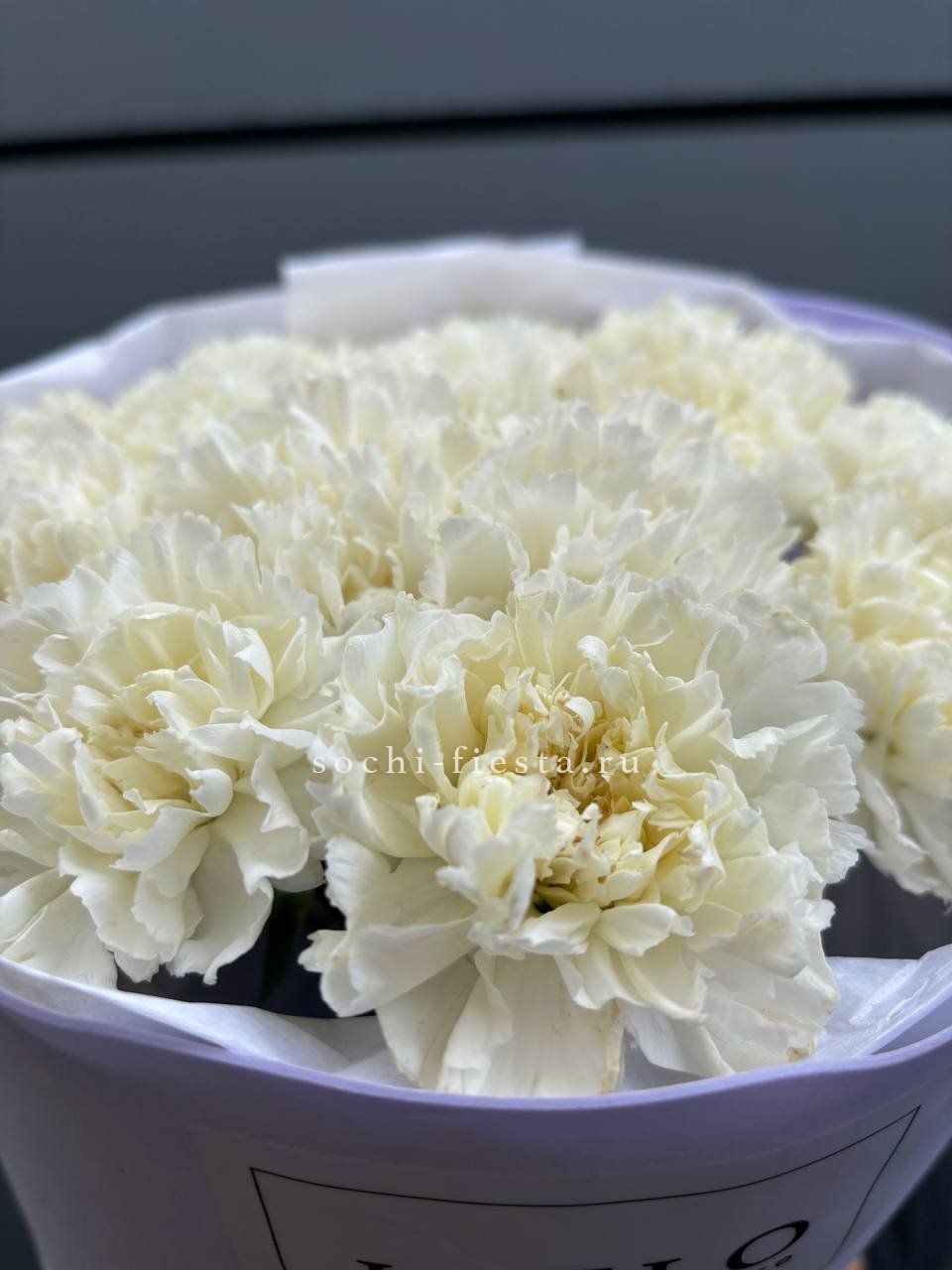 Белоснежные диантусы раскрываются плотными многослойными бутонами с резными краями лепестков. Каждый цветок создаёт объёмную текстуру и игру света на поверхности.