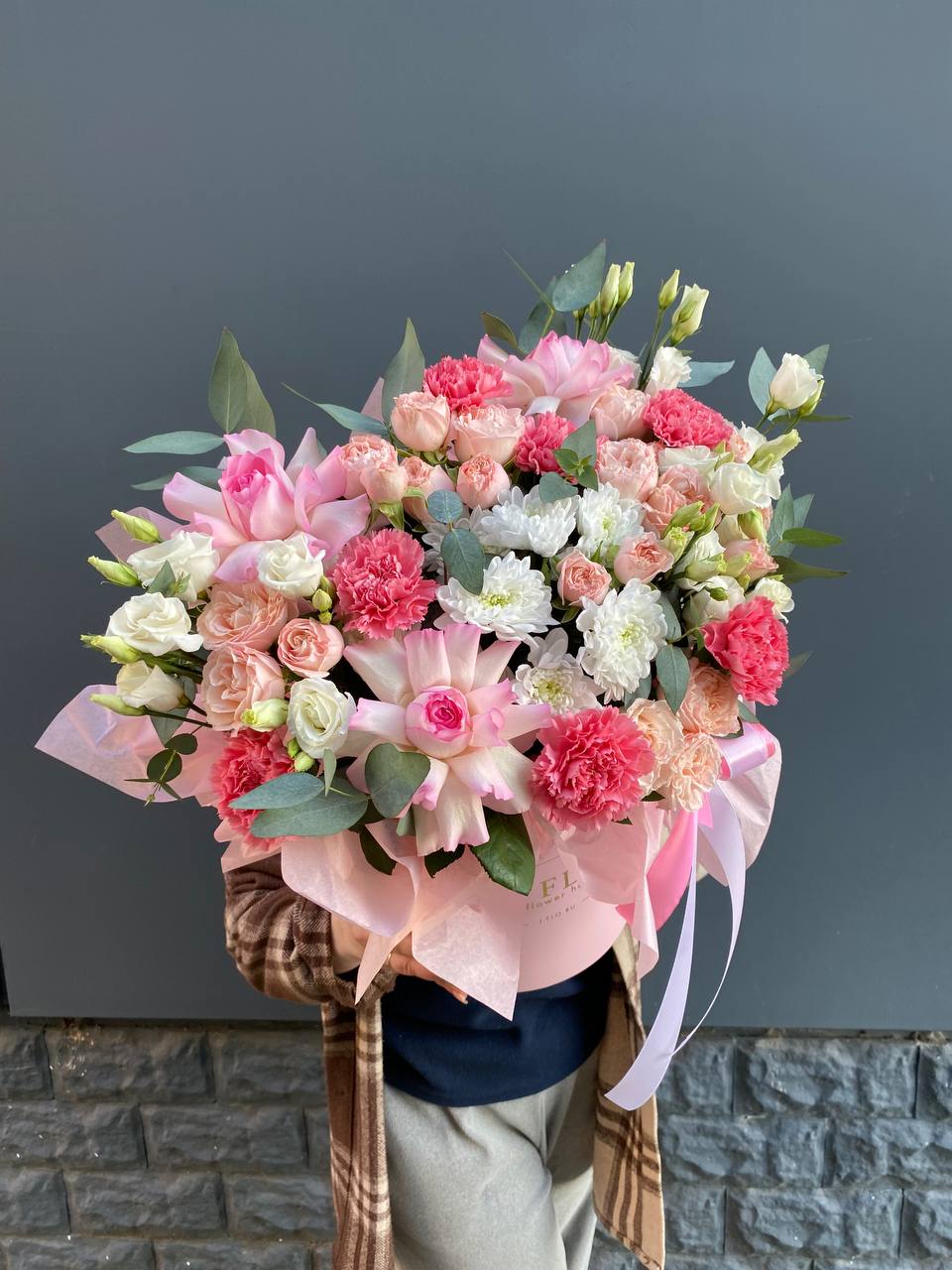 Пышная композиция в круглом боксе объединяет розы, эустому, хризантемы и диантус в плотную цветущую массу. Бомбастик добавляет объёма, а эвкалипт смягчает переходы между соцветиями. Готовое решение для размещения на столе или комоде.