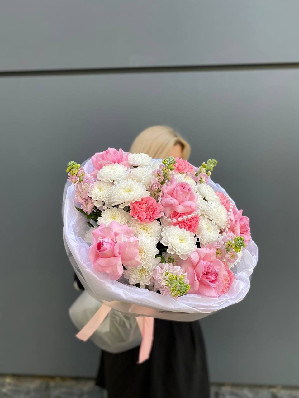 хризантема, маттиола, диантусы, розы с элементами бусин в воздушном оформлении.