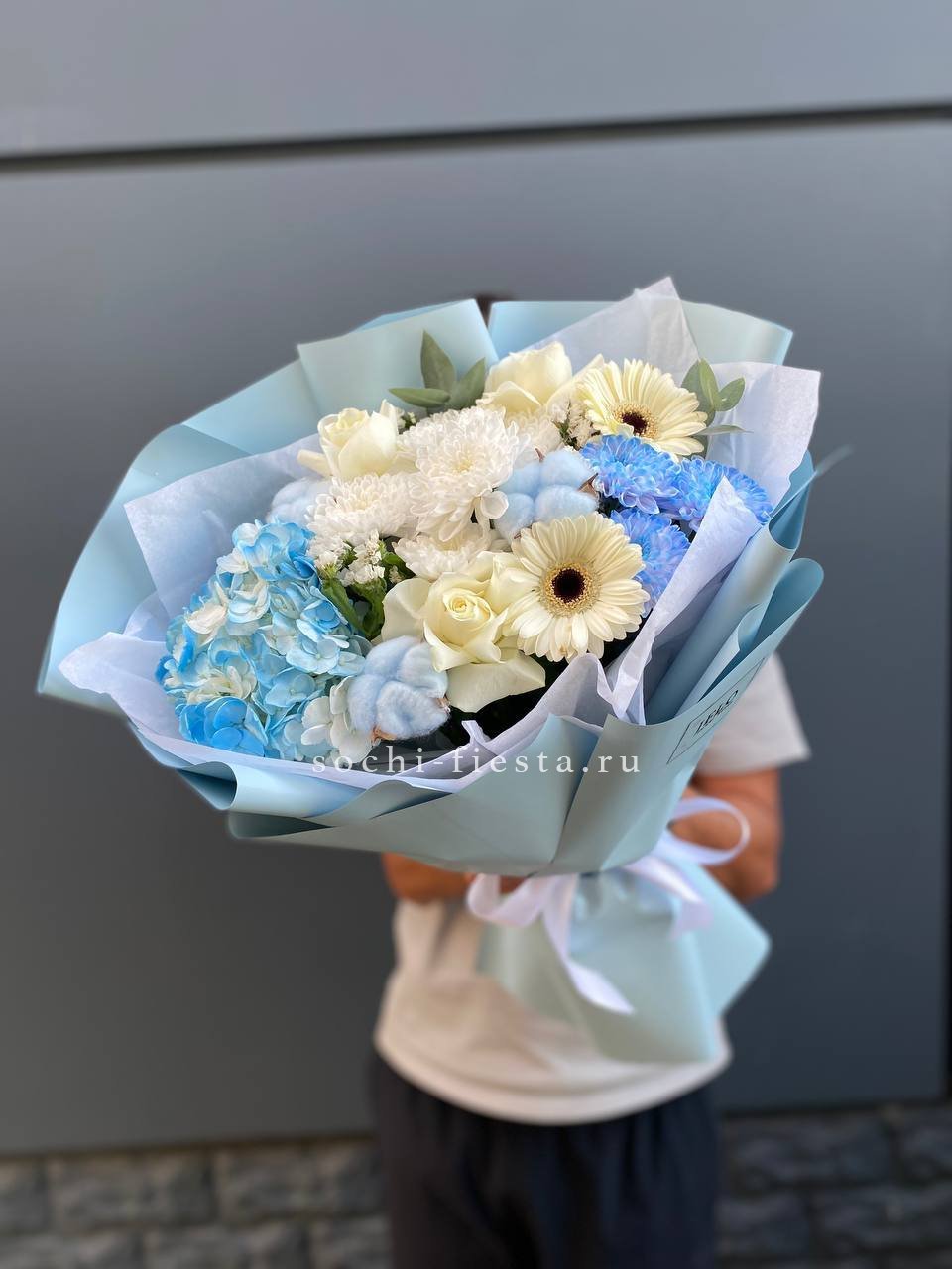 гортензия, хризантема, белая роза, гербера, статица, хлопок, упаковка.