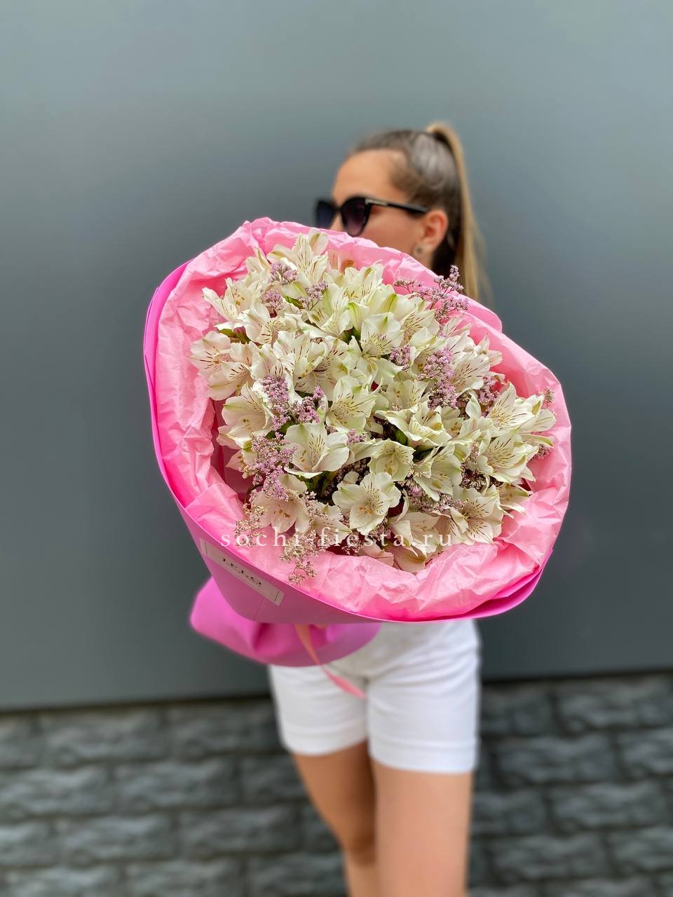 Одиннадцать белых альстромерий собраны в плотный букет с воздушным лимониумом. Светлая гамма и простая форма легко вписываются в любой интерьер. Универсальное решение для дома или в подарок близким.