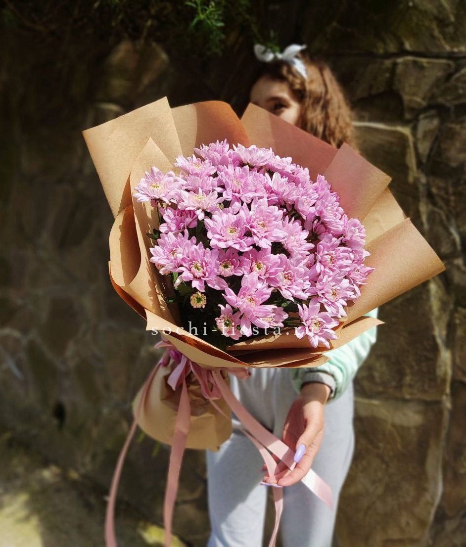 15-17 веток кустовых хризантем (белая + розовая), фоамиран, дизайнерская пленка.