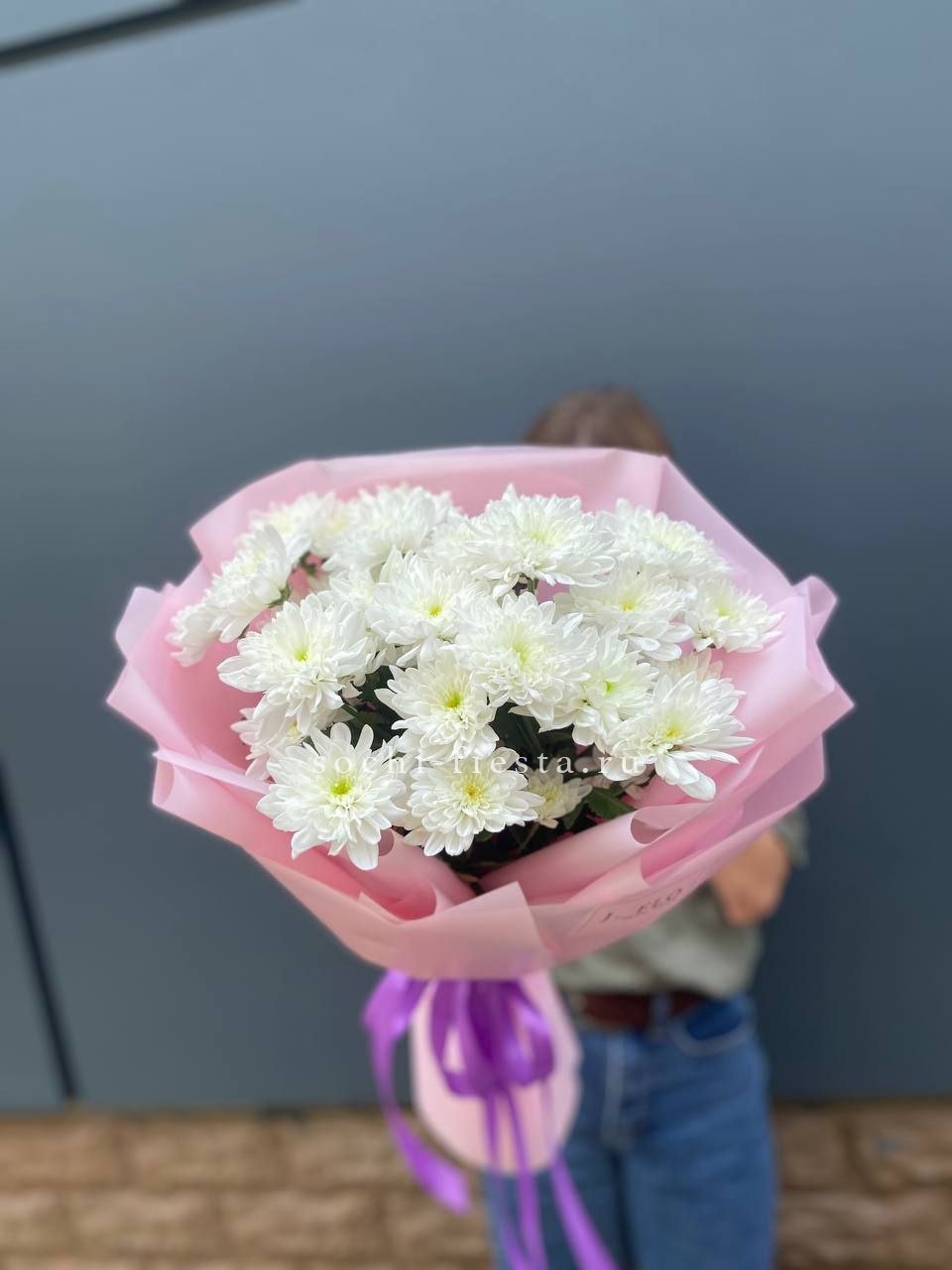 Сиреневая гамма с переходом в розовый создаёт мягкую дымку соцветий. Кустовые хризантемы собраны в плотную шапку, где каждая ветка раскрывается своим ритмом. Монохромная композиция для тех, кто ценит спокойную красоту.
