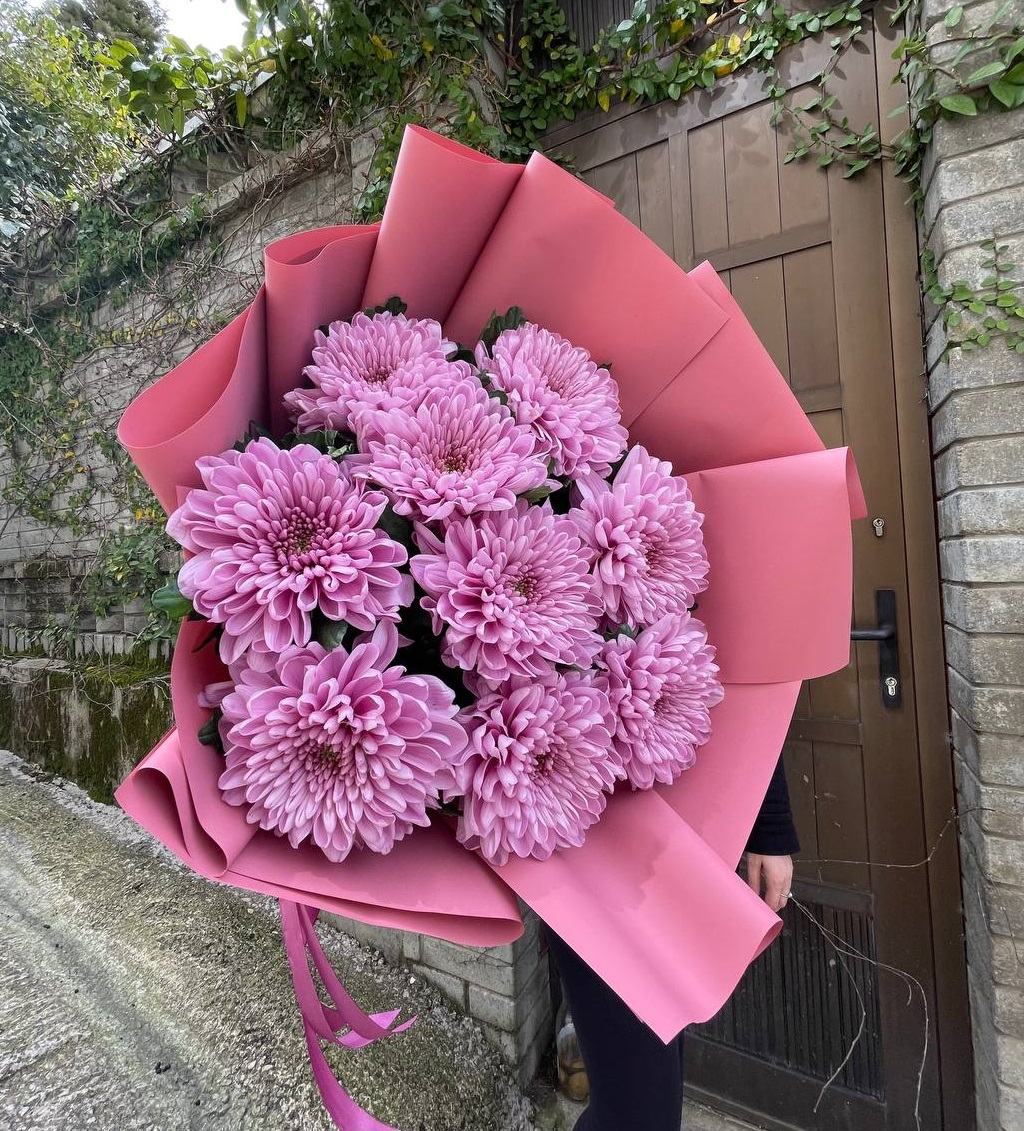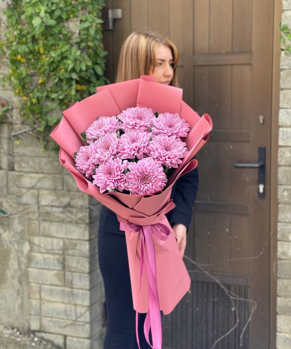 Девять хризантем Бигуди с игольчатыми лепестками необычной формы. Каждый бутон напоминает фактурный шар с закрученными концами, создавая эффектную текстуру и живую динамику.