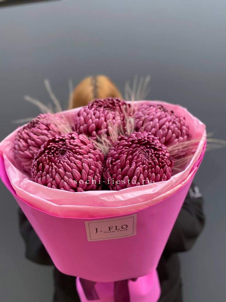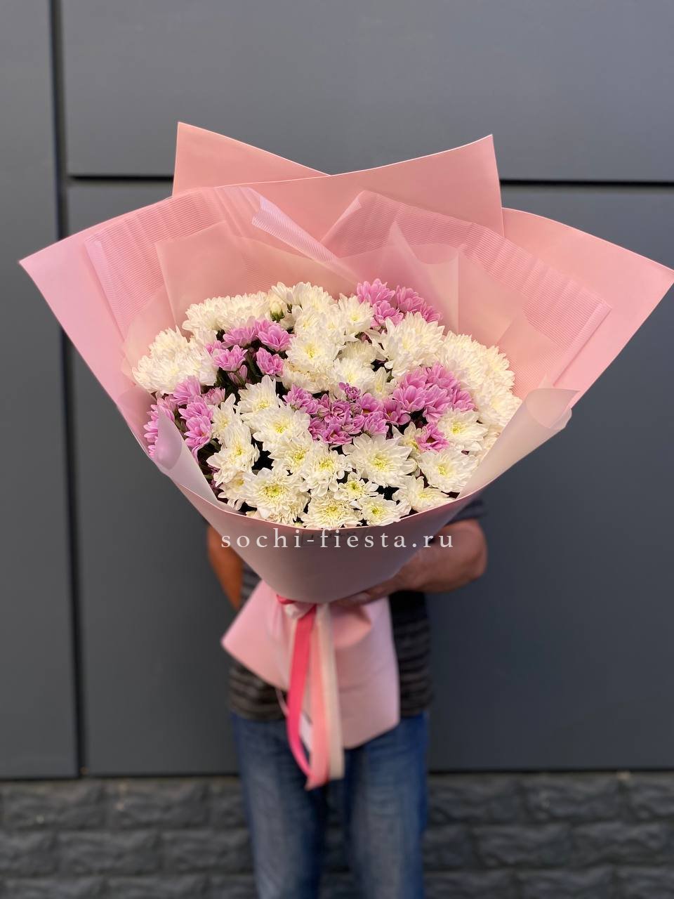 хризантемы Бигуди - 5, стифа (аналог по сезону),  лента, дизайнерская упаковка.
