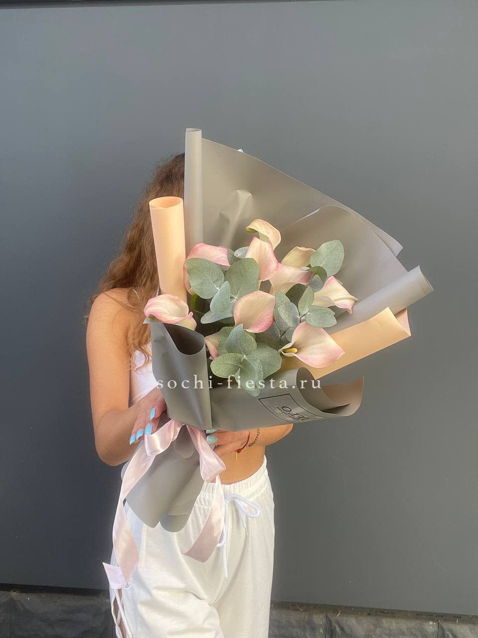Девять калл собраны в плотную вертикальную композицию с графичными линиями стеблей и строгими соцветиями. Декоративная зелень добавляет объём, сохраняя лаконичность формы. Букет для тех, кто ценит выразительность без лишних деталей.