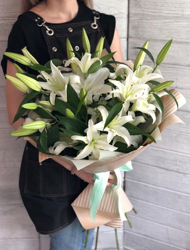 Пятьдесят один стебель лилий в плотной сборке. Бутоны раскрываются постепенно, продлевая жизнь композиции на долгие дни. Высокий букет с выразительным присутствием в любом пространстве.
