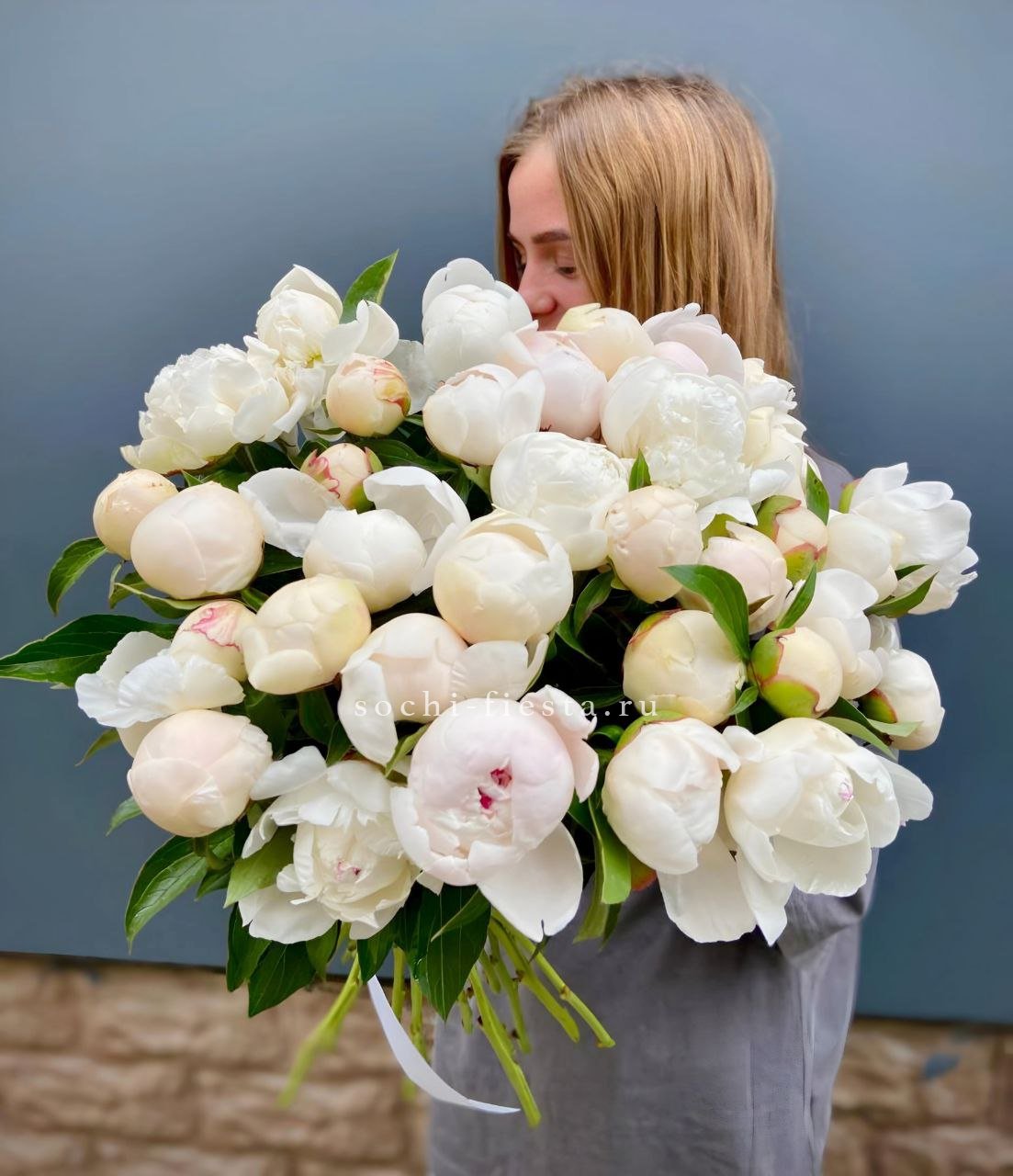 Тридцать пять пионов образуют объёмную охапку с живописной свободной формой. Такой букет занимает пространство и создаёт яркое визуальное присутствие в любом интерьере.