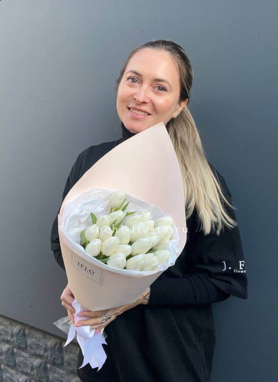 Девятнадцать тюльпанов с упругими закрытыми бутонами. Белые лепестки постепенно раскроются и покажут всю глубину цветка. Букет будет радовать свежестью несколько дней.