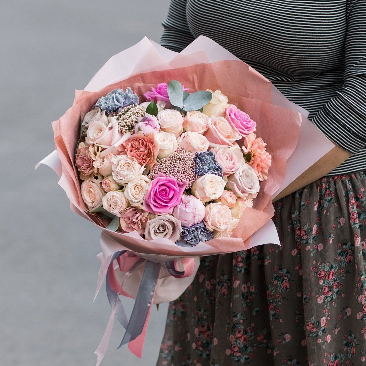 Пионовидные розы образуют пышное ядро композиции, а диантусы добавляют воздушные акценты по краям. Эвкалипт создает естественное обрамление, подчеркивая объем и глубину сборки. Букет для тех, кто ценит авторский взгляд на классические формы.
