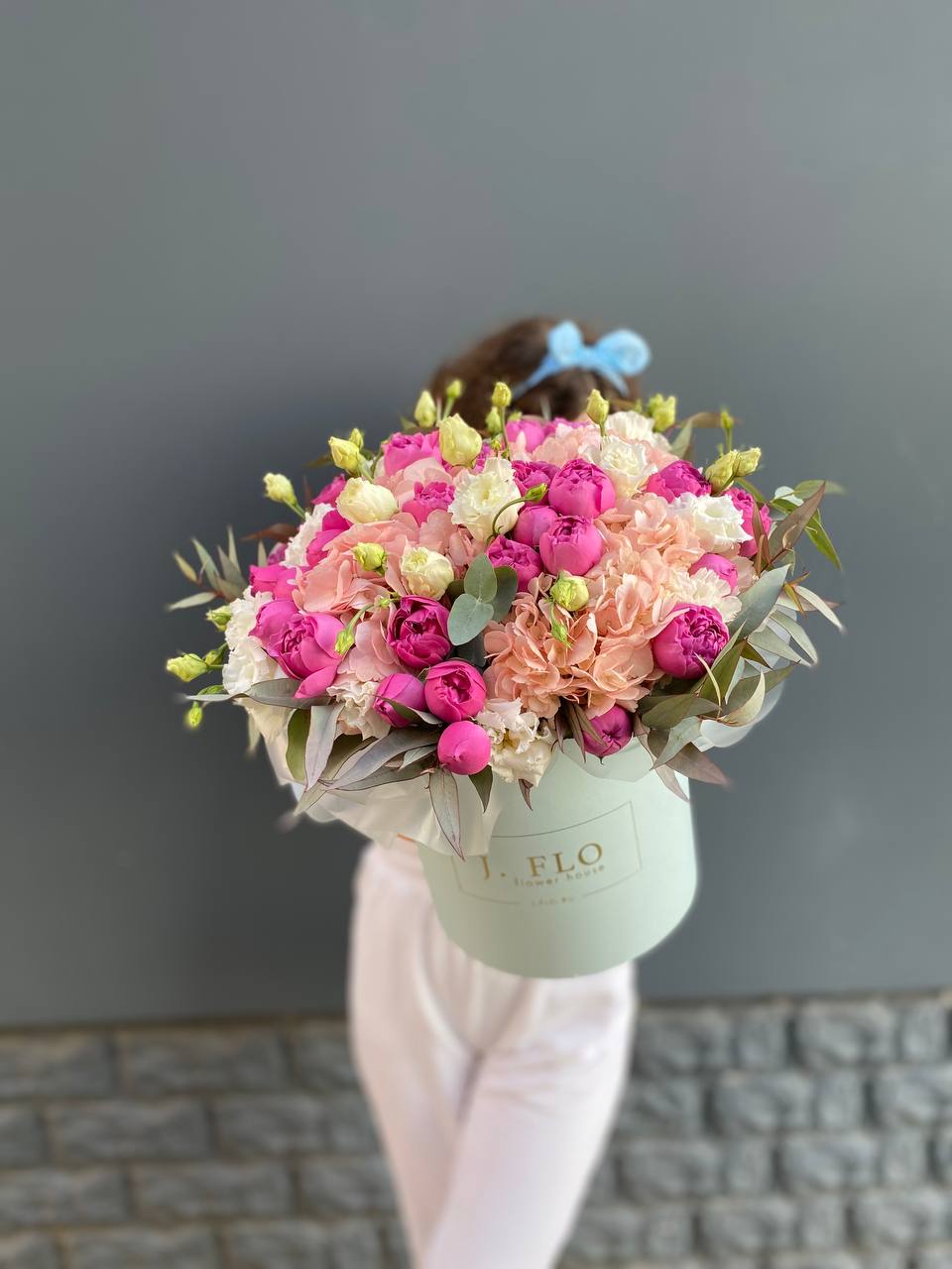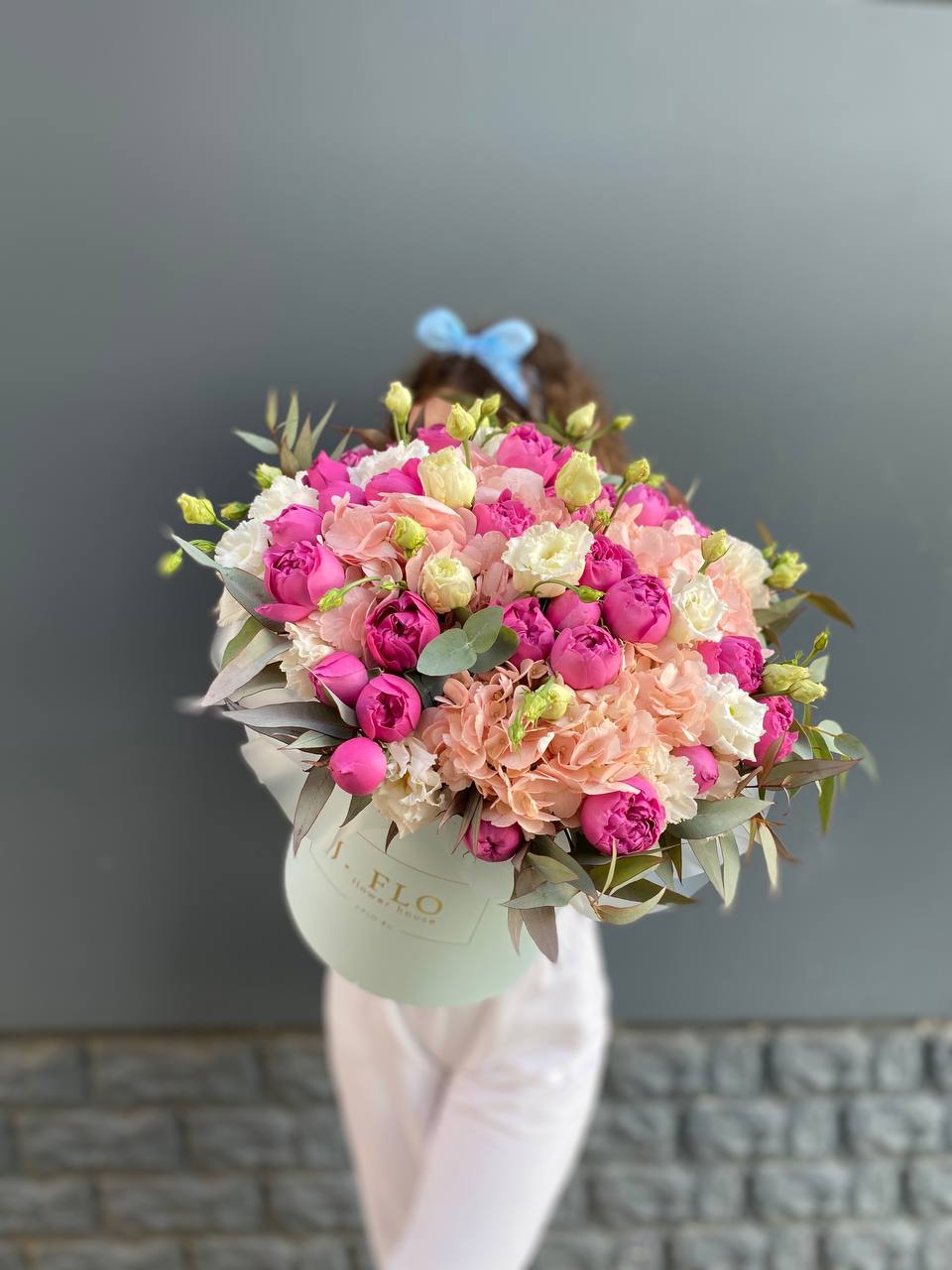 гортензия, белая роза, розовая роза, гербера, эустома, декоративная зелень, эвкалипт дизайнерское оформление, лента.