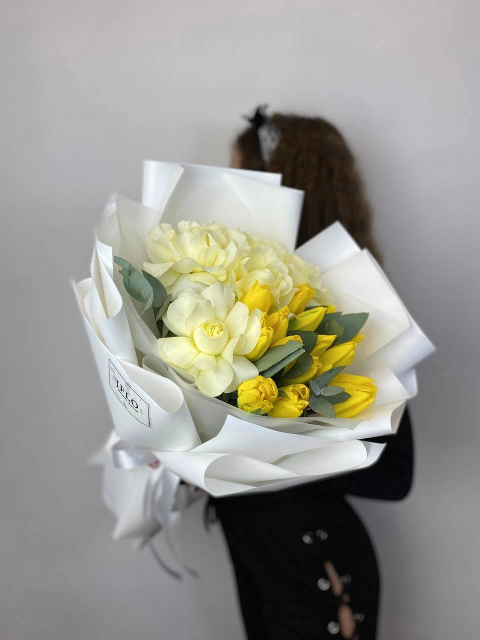 жёлтые тюльпаны, розы, эвкалипт, пленка.