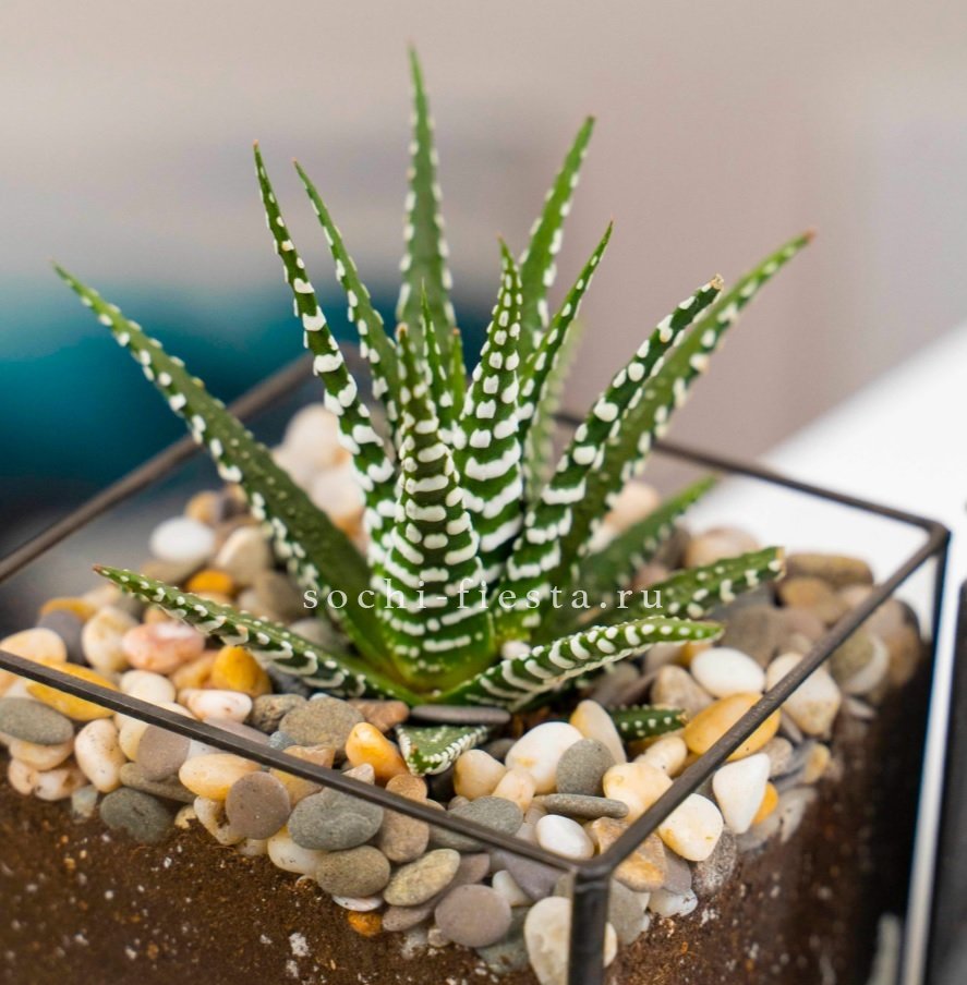 Компактный куб из стекла вмещает хавортию с острыми листьями и выразительной графикой. Это живое решение для рабочего стола или полки, где важна лаконичность.