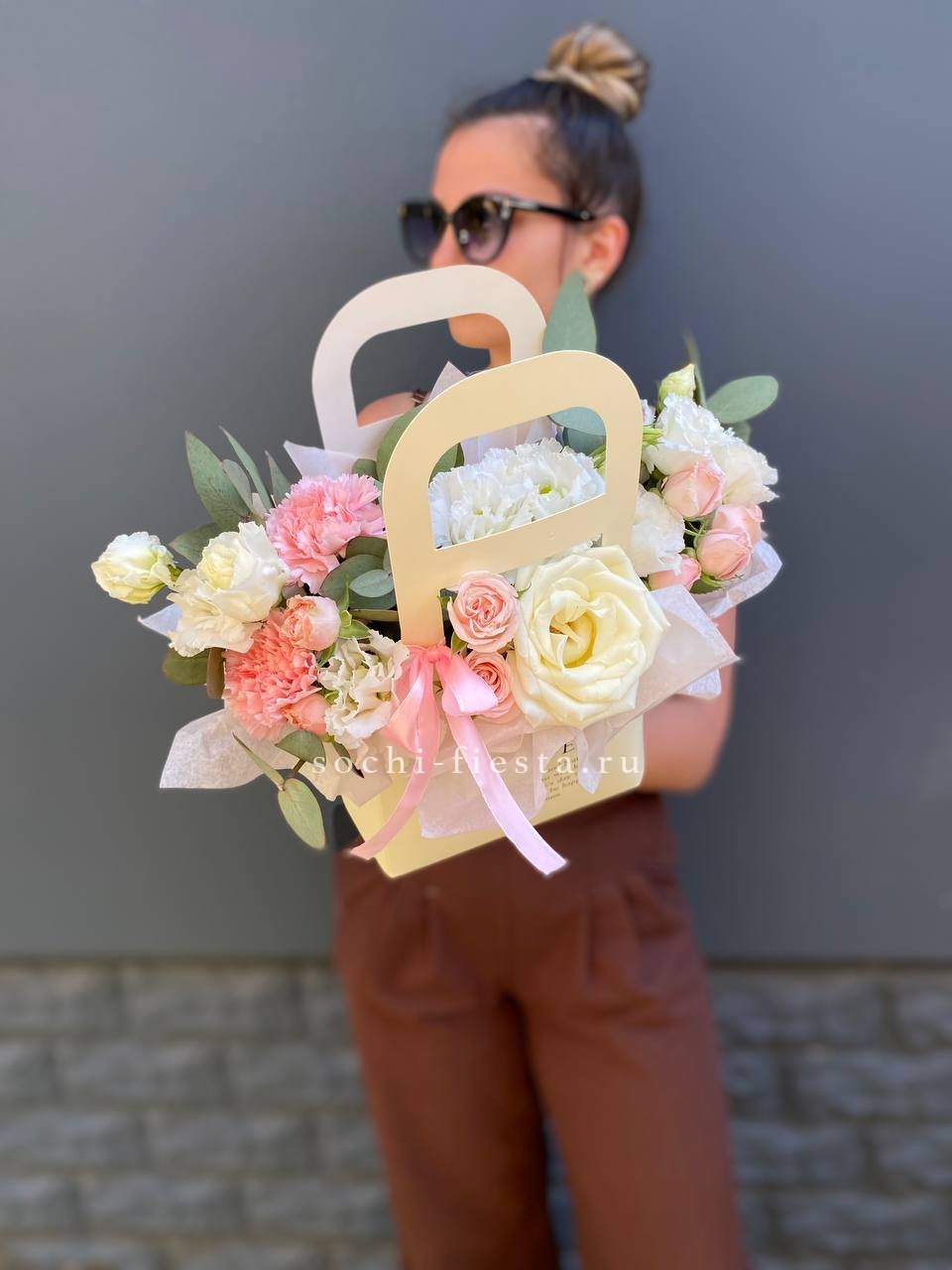 эустома, кустовые розы, белые розы, диантусы, лента, сумка-кашпо.