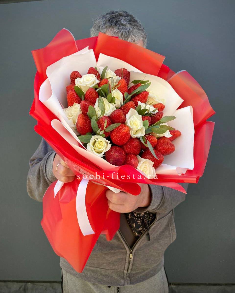 300-400г. ароматной клубники, кустовая роза, эвкалипт, лента, дизайнерская бумага.
