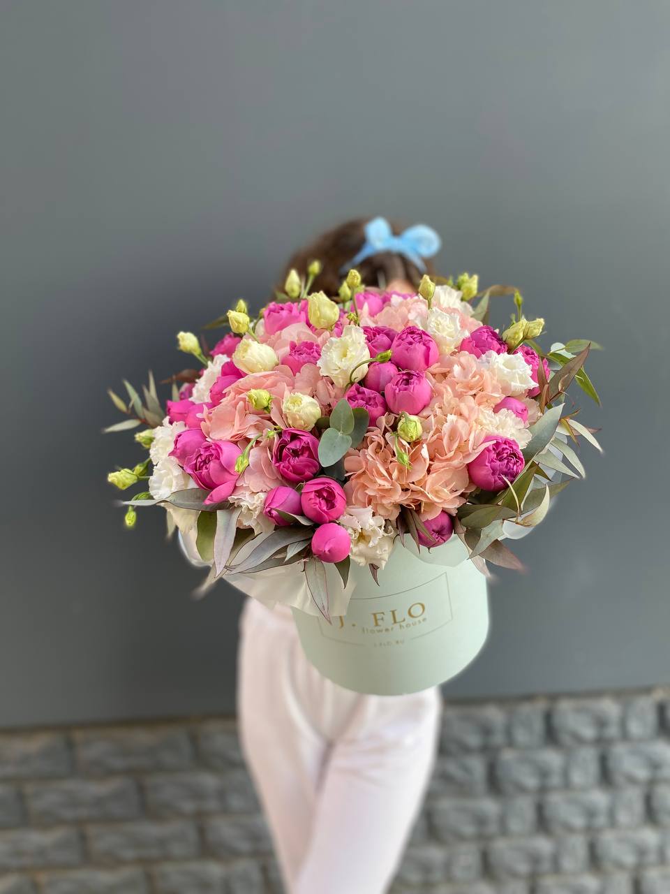 Пионовидные розы раскрываются пышными шапками среди воздушной гортензии и эустомы. Композиция собрана в круглом боксе и держит форму без дополнительной упаковки.