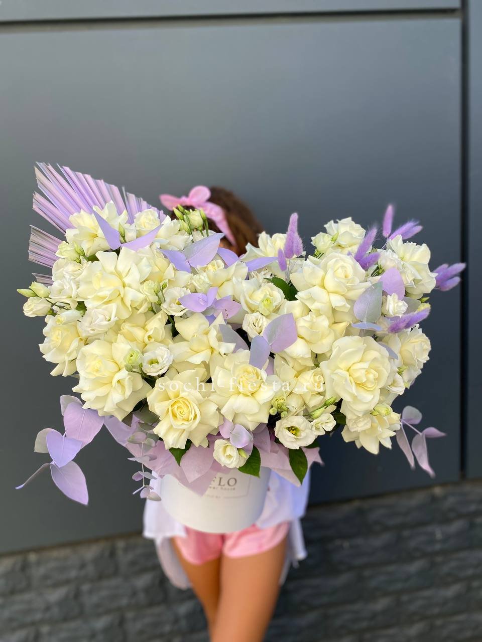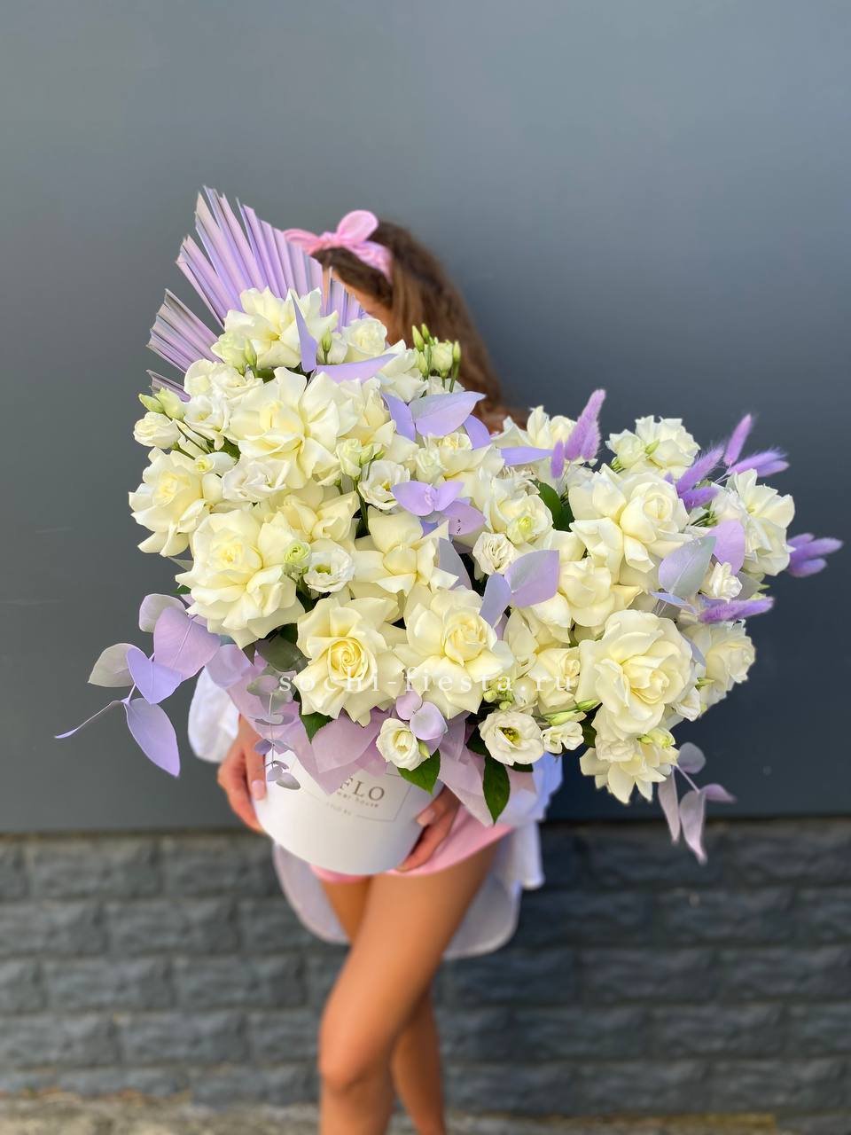 Широкий бокс объединяет пионовидные розы с пушистыми головками хлопка и воздушными метелками ковыля. Композиция построена на слоях: плотные бутоны у основания переходят в легкие текстуры по краям.