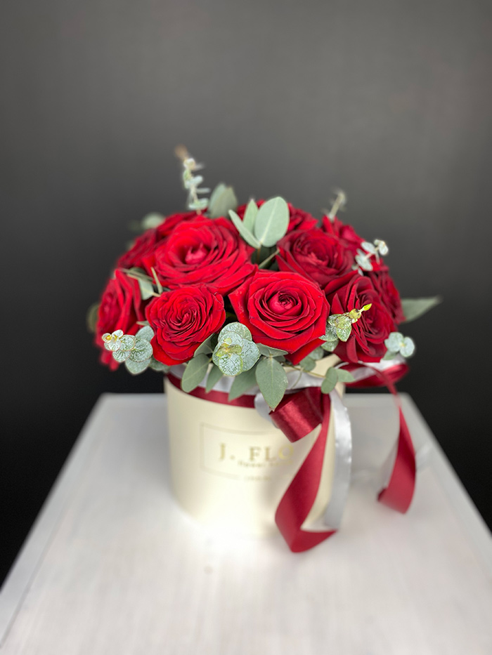 Белоснежные розы и герберы выстраивают чистую цветовую гамму с яркими акцентами диантусов. Эвкалипт вносит графичность и природную фактуру в общую композицию.