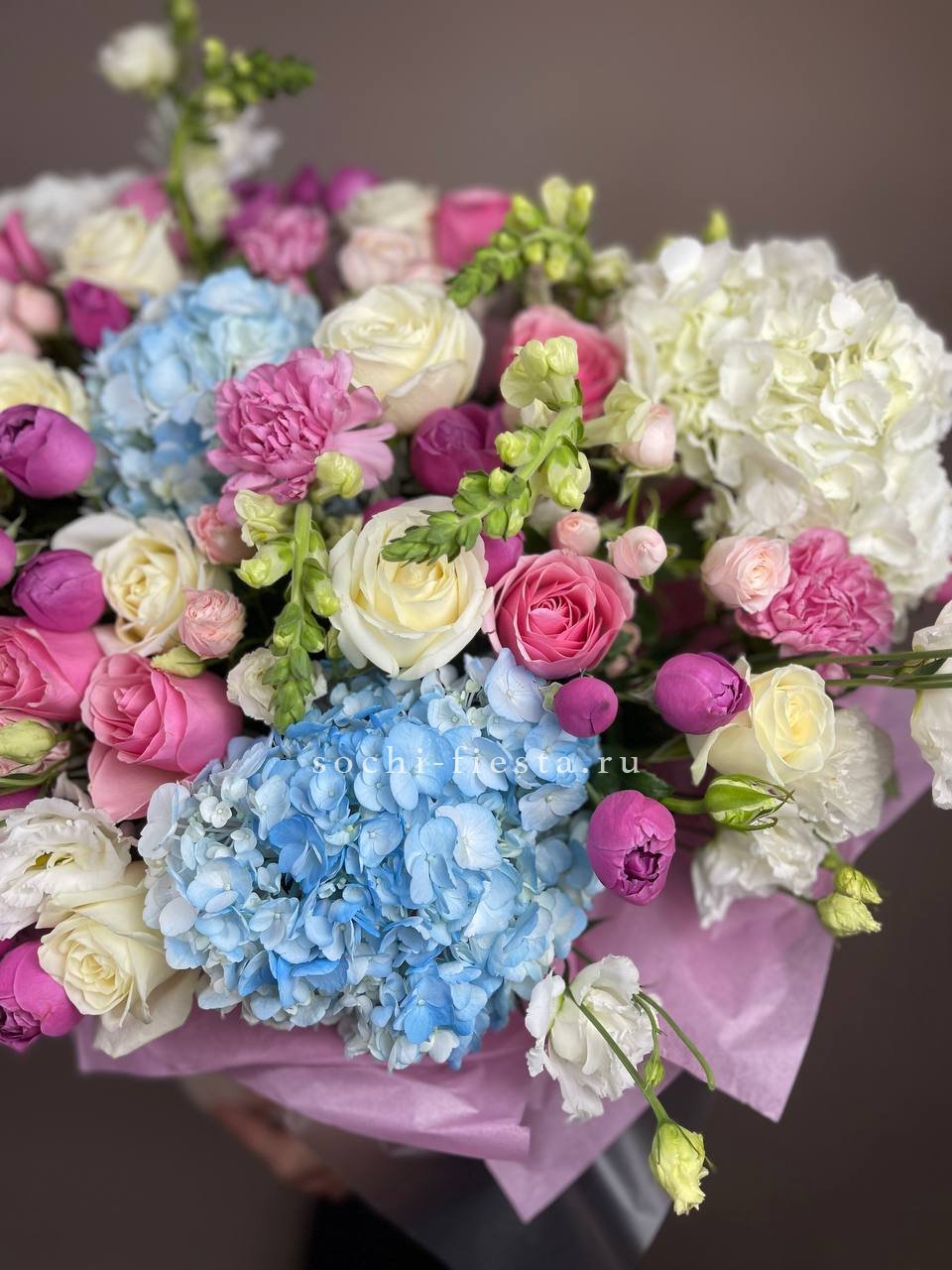 гортензия, диантус, бомбастик, мисти баблс, розы, антиринум, эустома, бокс гигант.
