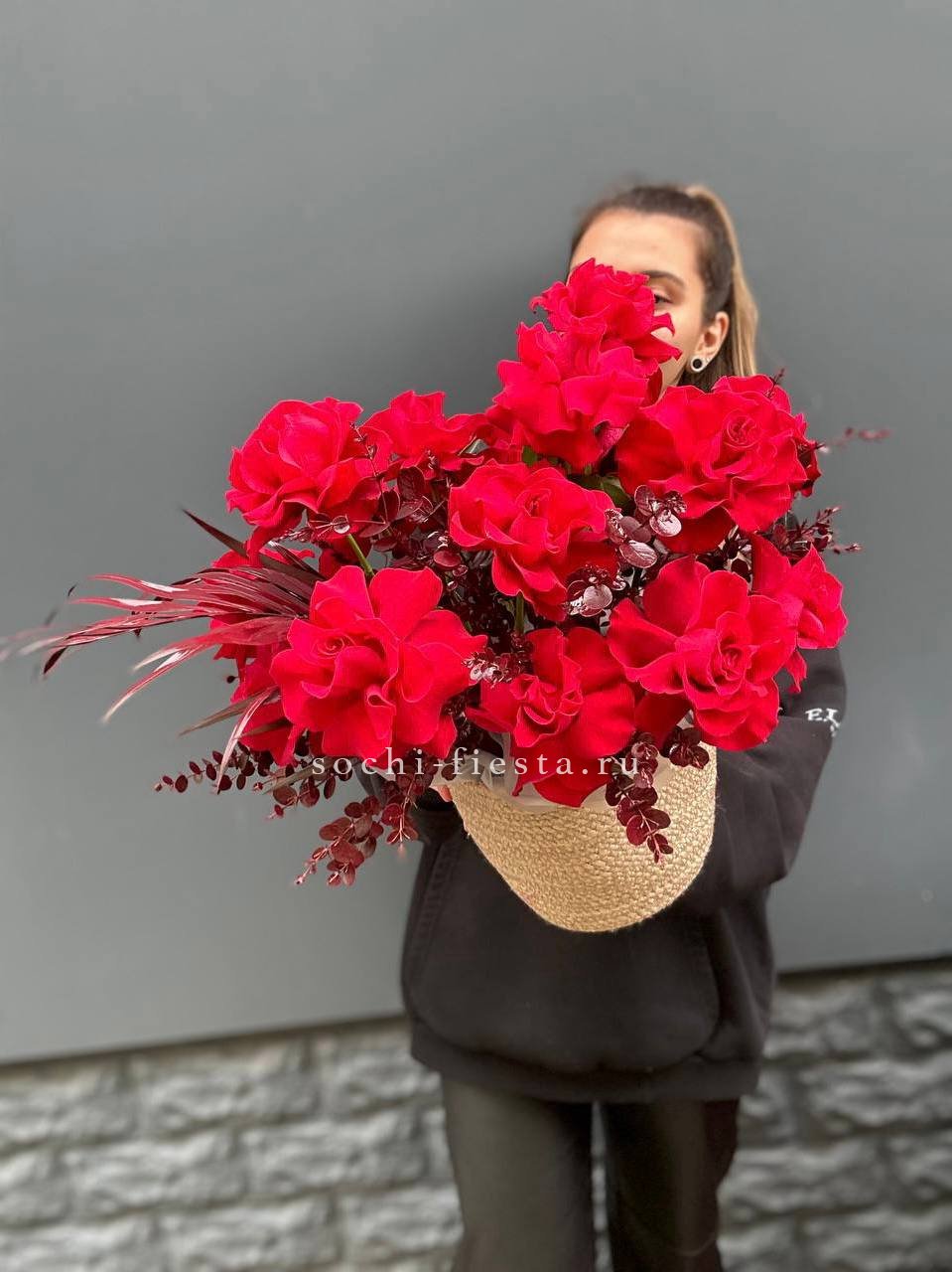 Французские розы теплого оттенка раскрываются в окружении эвкалипта и листьев Чико. Композиция в джутовом кашпо выглядит самодостаточно и гармонично вписывается в любое пространство.