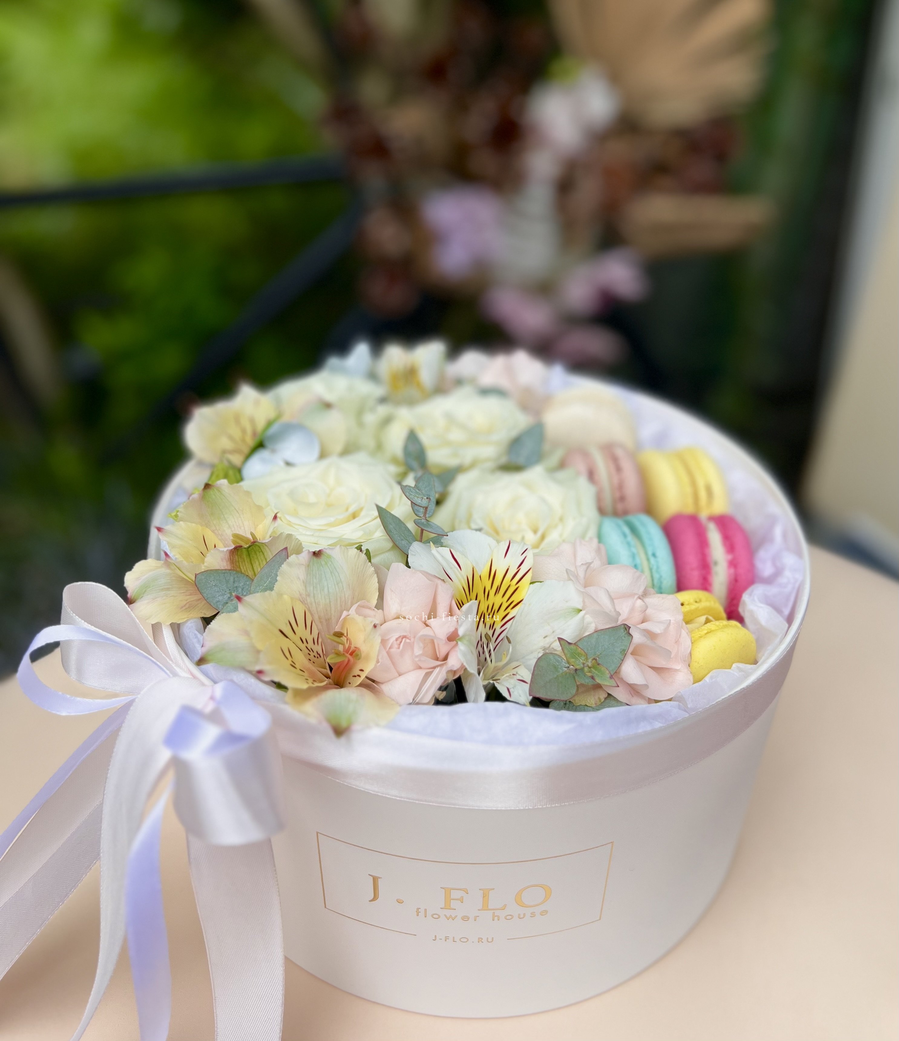 Микс сезонных цветов в цилиндре радует разнообразием бутонов и оттенков. Пять макаронс дополняют живую палитру и делают презент готовым к вручению.