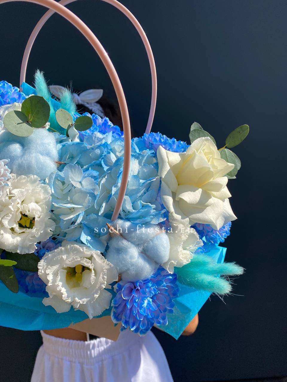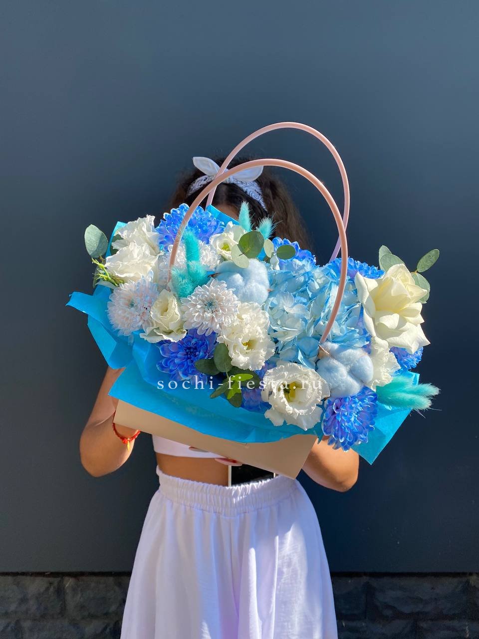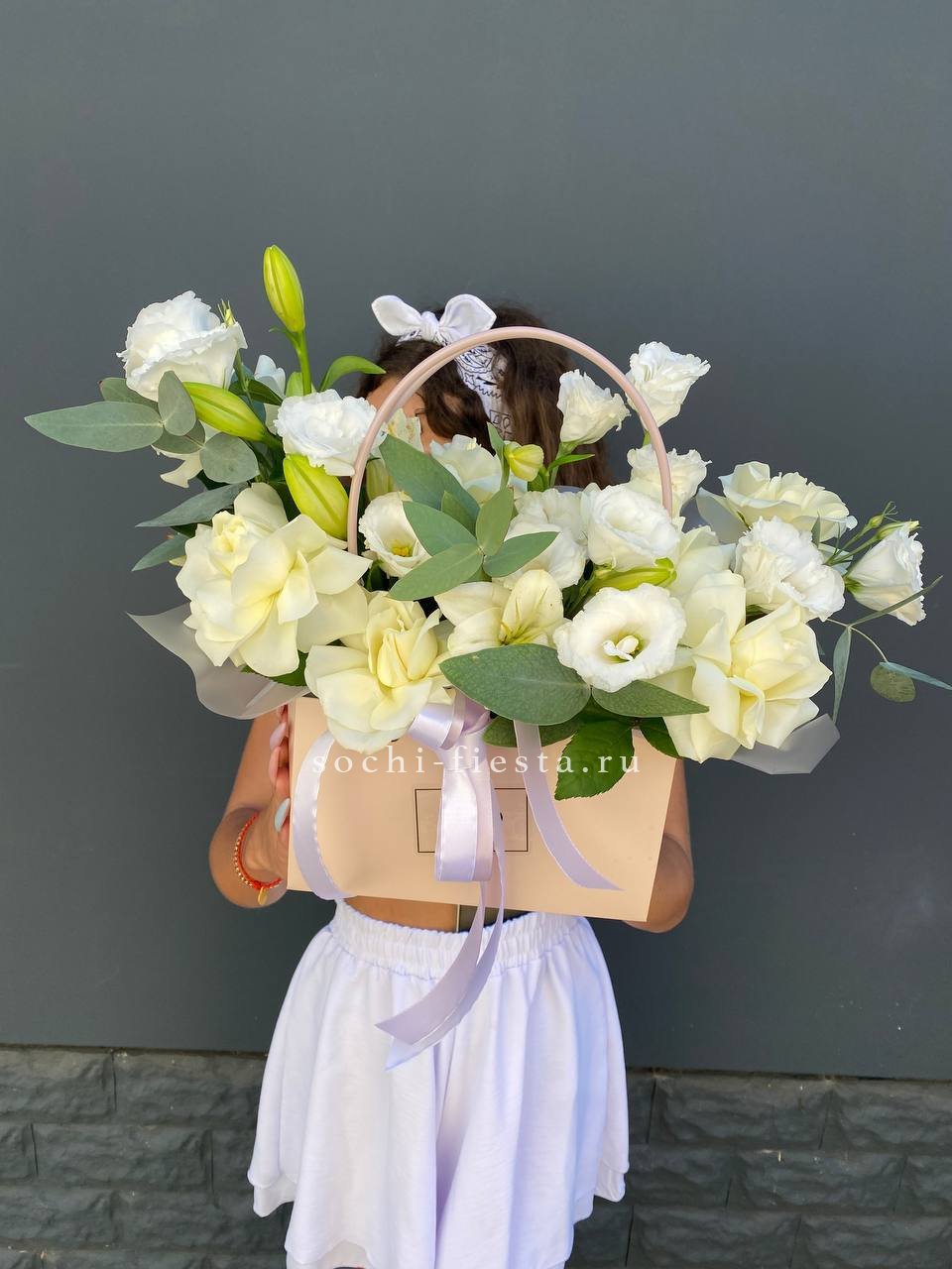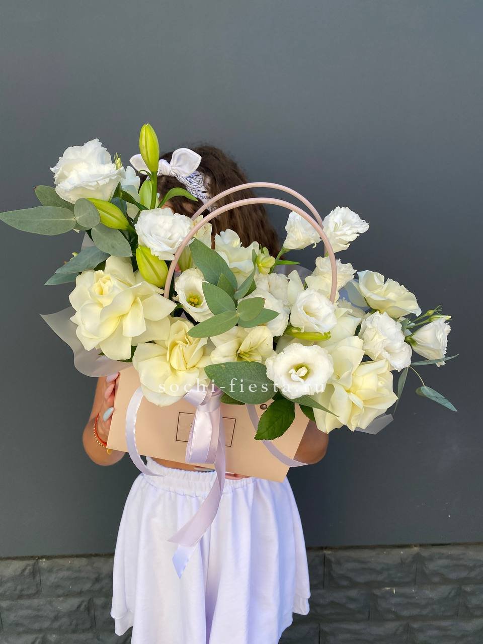 Герберы задают ритм композиции яркими пятнами среди белых роз и кустовой хризантемы. Лимониум заполняет объём воздушной текстурой. Сумка-кашпо удерживает форму и позволяет поставить букет без дополнительной вазы.