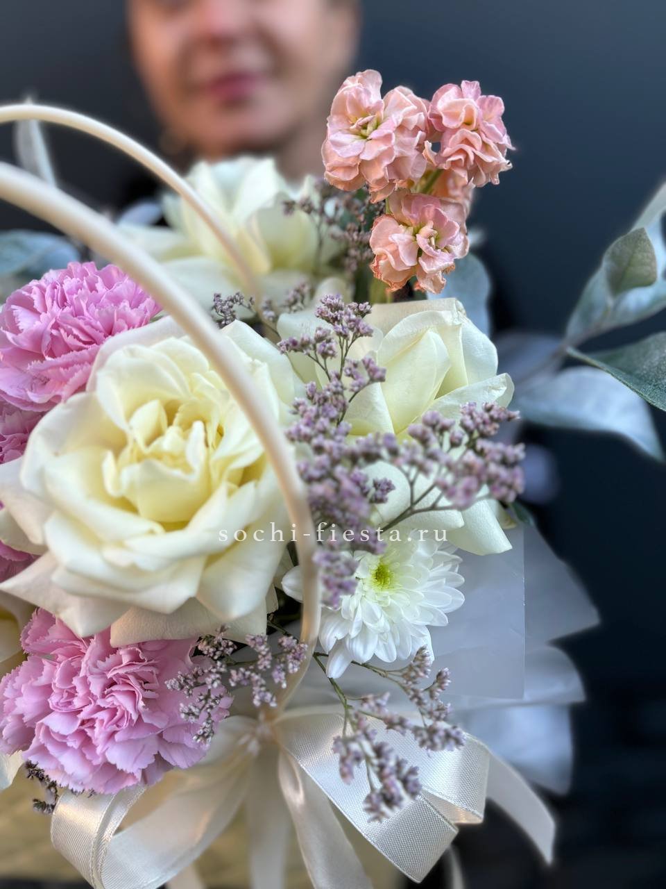 герберы , диантусы, белая роза, маттиола, хризантема кустовая, лента, сумка-кашпо.