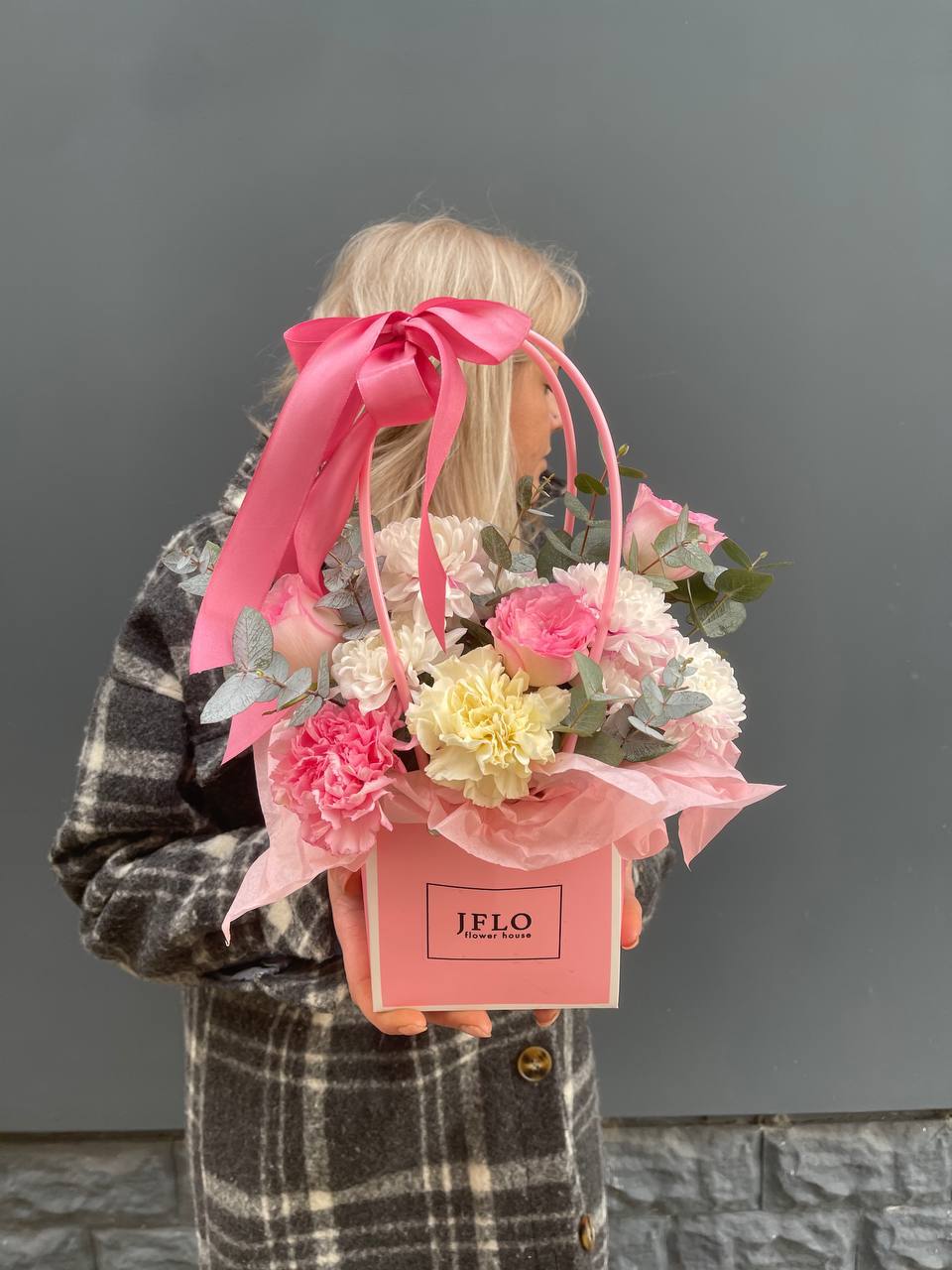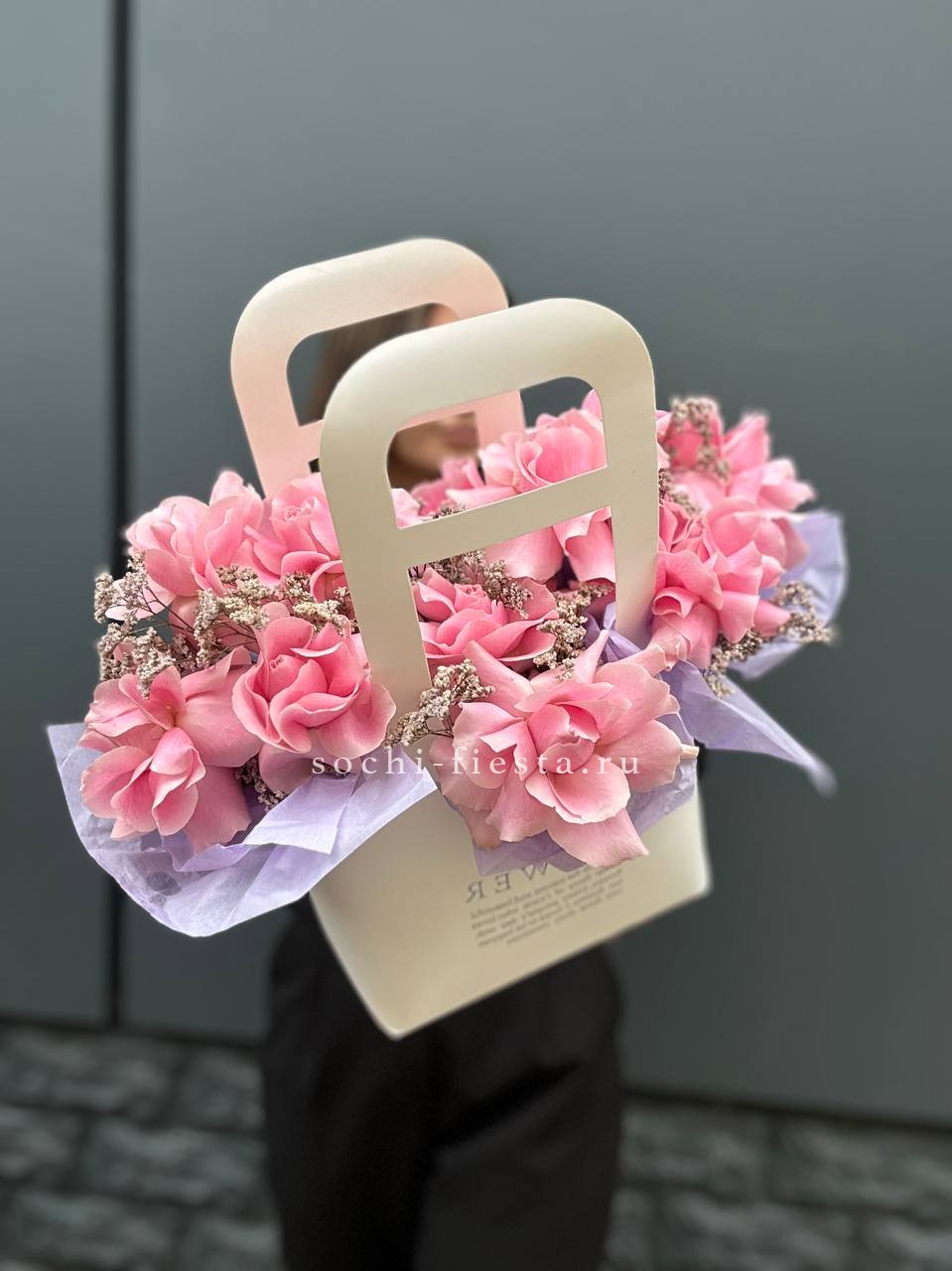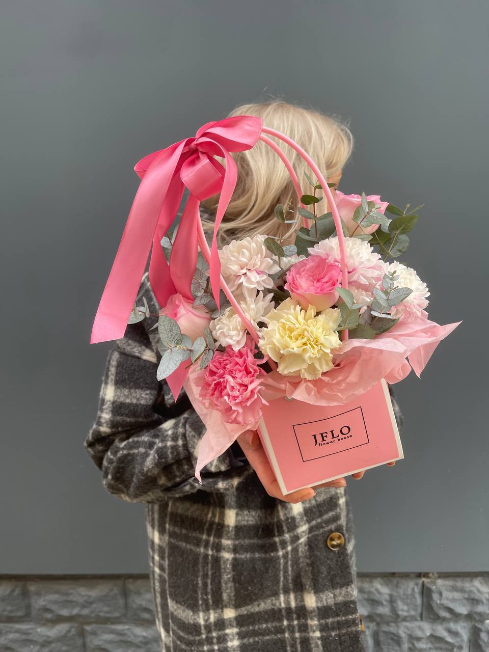 Хризантемы с пушистыми коробочками хлопка создают теплую домашнюю композицию в удобной сумочке. Цветы долго радуют взгляд и не требуют сложного ухода. Формат подходит для размещения в любом уголке дома.
