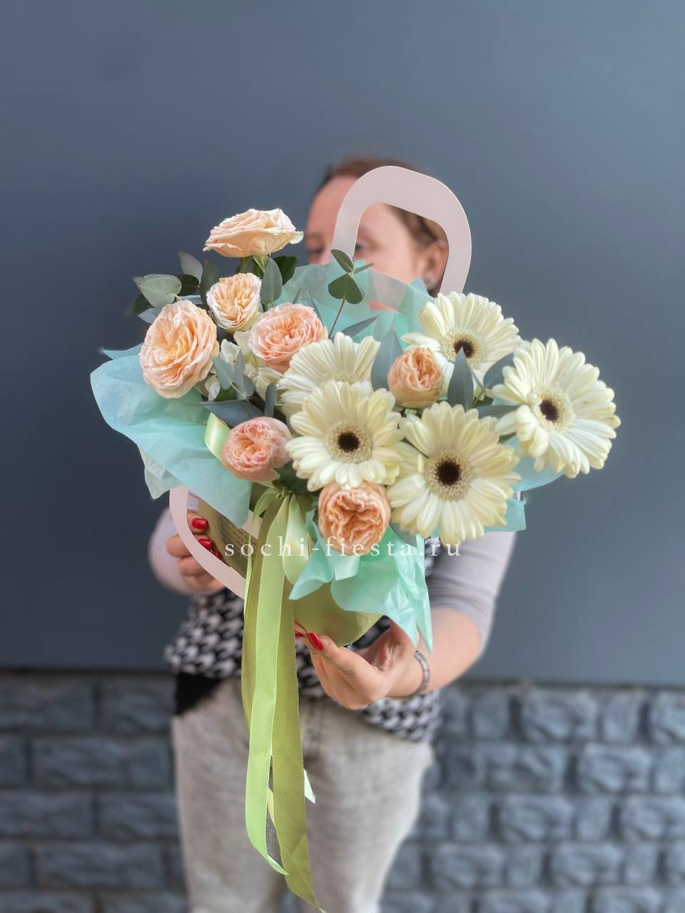 Гортензия создает объемную базу, а герберы и кустовые розы добавляют яркие акценты по всей композиции. Эвкалипт обрамляет сумочку легкими серебристыми ветвями.