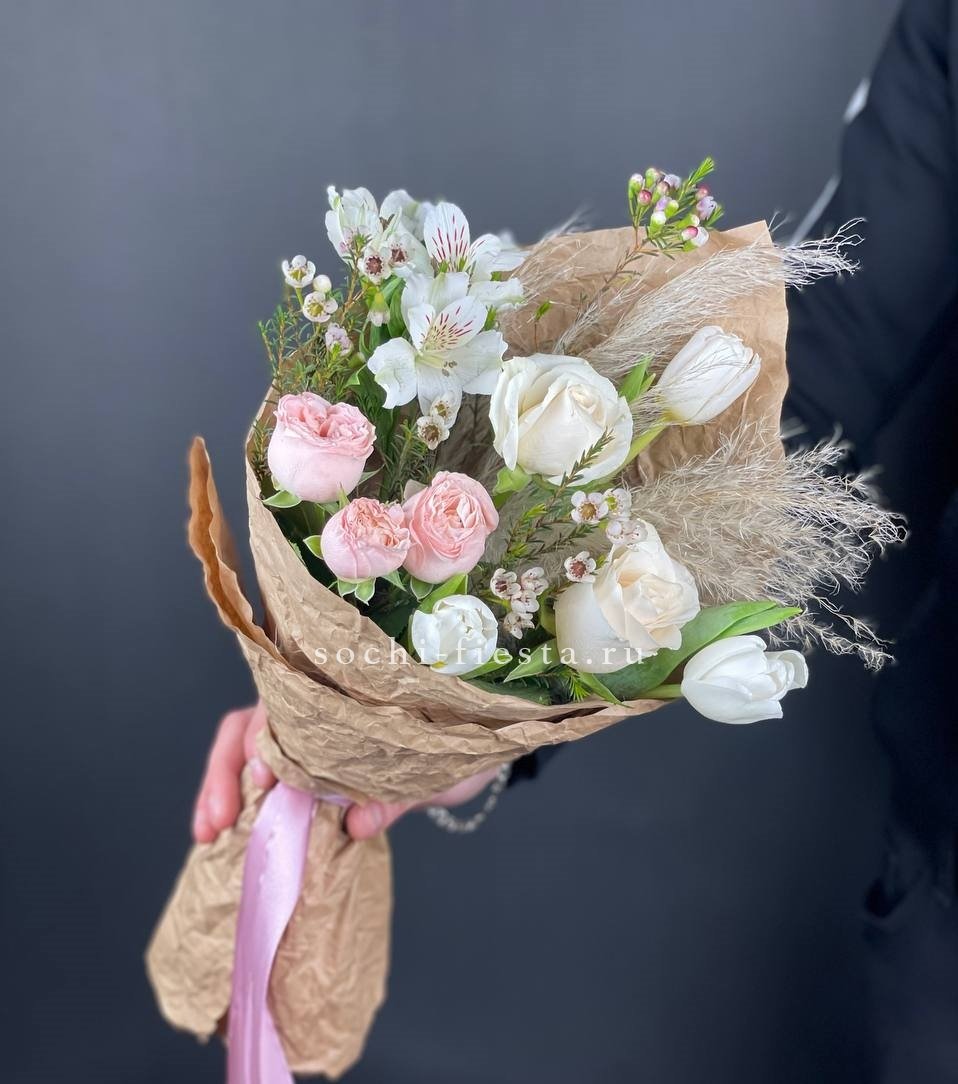 Компактный букет из сезонных цветов в природной гамме с лаконичным оформлением из крафта и бечёвки. Простая форма и естественный ритм лепестков создают непринуждённое впечатление.