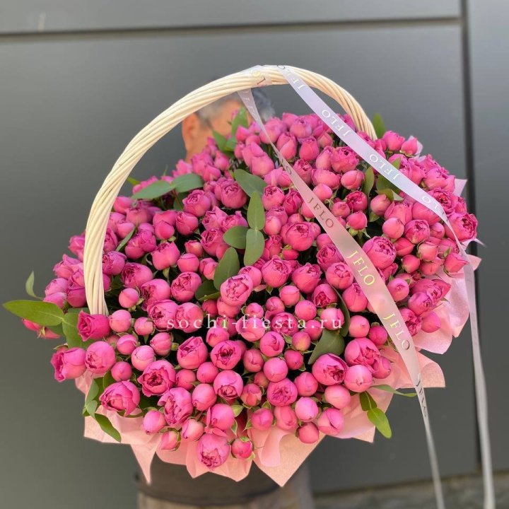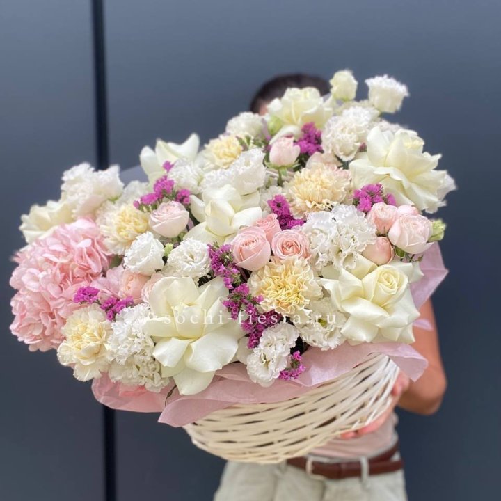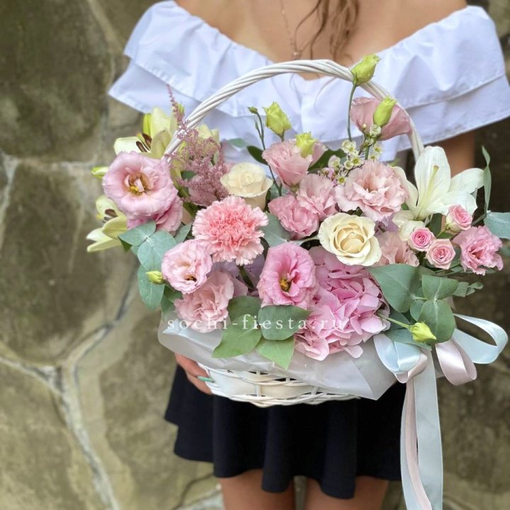 Состав корзин в Улан-Удэ определяется текущими поставками и сезоном. Розы Freedom, Mondial, Cappuccino — для классических куполообразных аранжировок. Пионы в мае-июне из свежих поставок: Sarah Bernhardt, Red Charm, Bowl of Cream — главный сезонный продукт. Хризантема, альстромерия, гербера — для объёмных торжественных наполнений. Эустома, ранункули — для садовых корзин. Флорист строит состав под конкретный запрос.