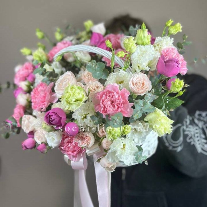 Состав корзин в Улан-Удэ определяется текущими поставками и сезоном. Розы Freedom, Mondial, Cappuccino — для классических куполообразных аранжировок. Пионы в мае-июне из свежих поставок: Sarah Bernhardt, Red Charm, Bowl of Cream — главный сезонный продукт. Хризантема, альстромерия, гербера — для объёмных торжественных наполнений. Эустома, ранункули — для садовых корзин. Флорист строит состав под конкретный запрос.