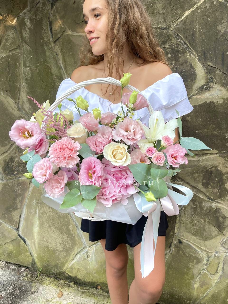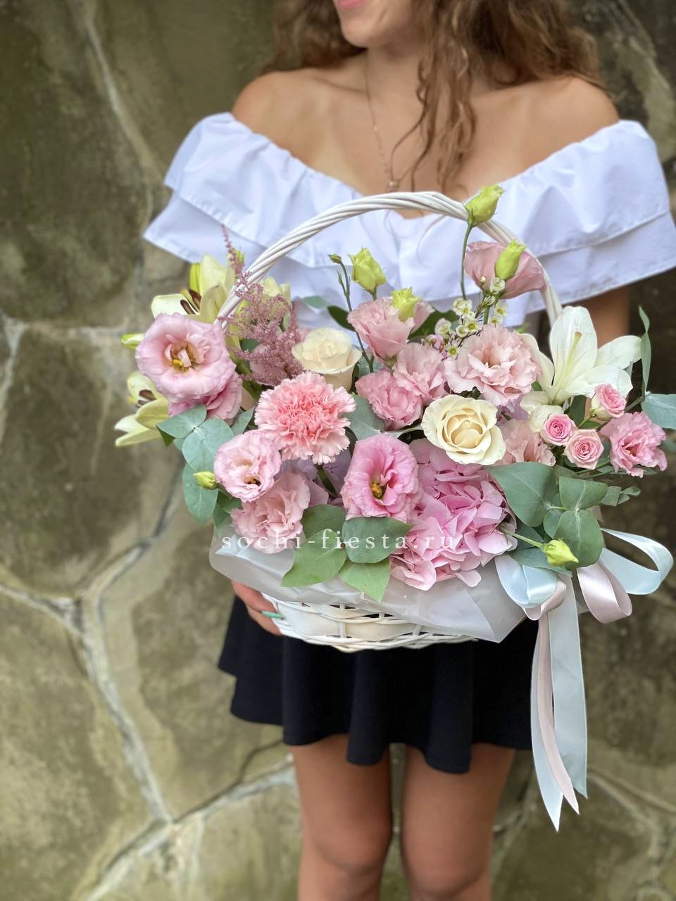 гортензия нежно-розовых оттенков, эустома, лилии, диантус, кустовая роза, эвкалипт, вспомогательная зелень, лента, светлая корзина.