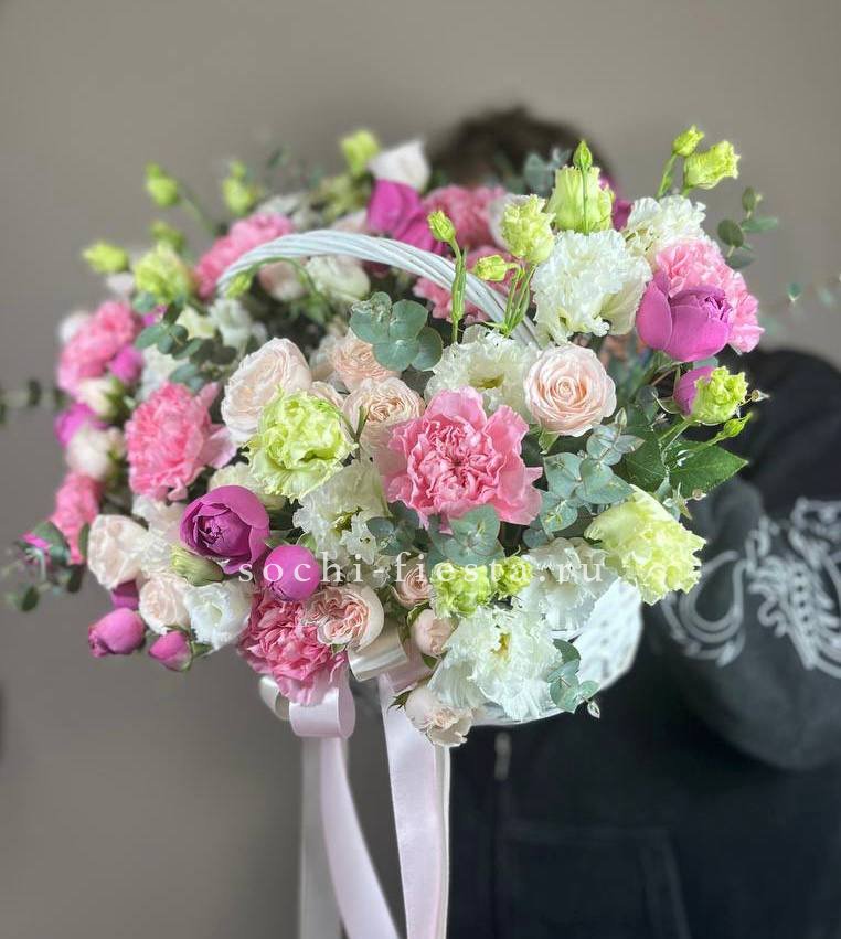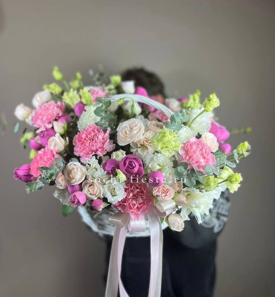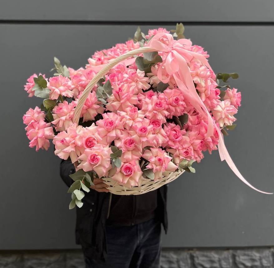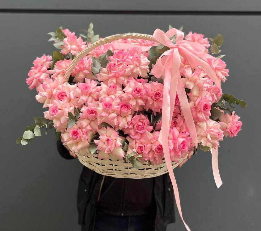 Пышная корзина с кустовыми розами и эустомой создает ощущение летнего изобилия. Диантусы добавляют воздушности между крупными бутонами, формируя объемную композицию. Готовое решение для яркого поздравления в удобной форме.
