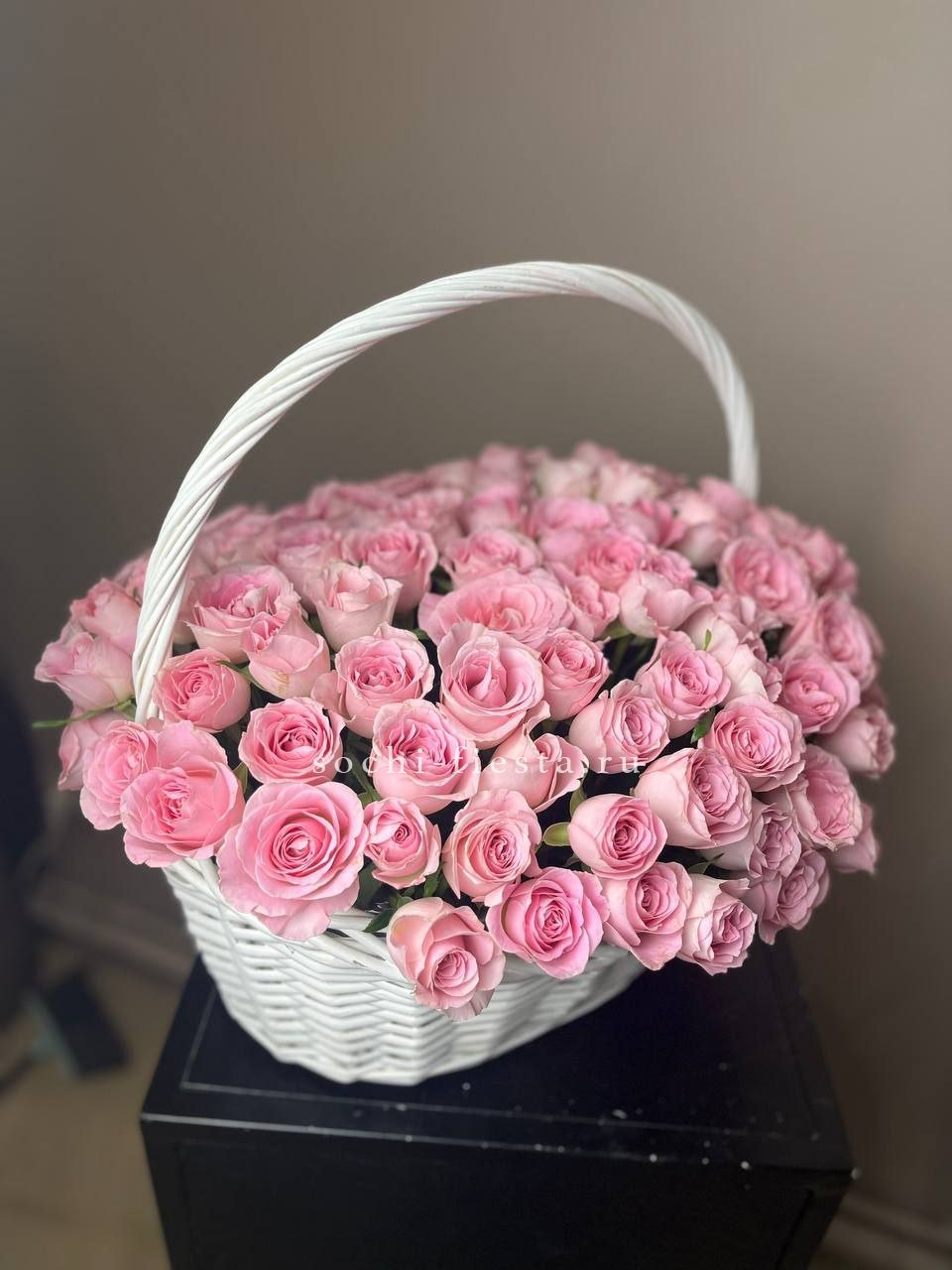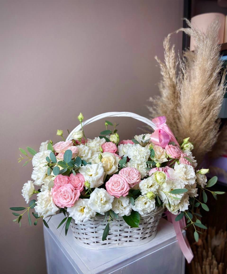 Двадцать пять французских роз в корзине создают плавный переход от светлых розовых тонов к насыщенной фуксии. Эвкалипт добавляет свежести и завершает композицию естественной зеленью. Букет удобно разместить на столе или комоде благодаря устойчивой корзине.