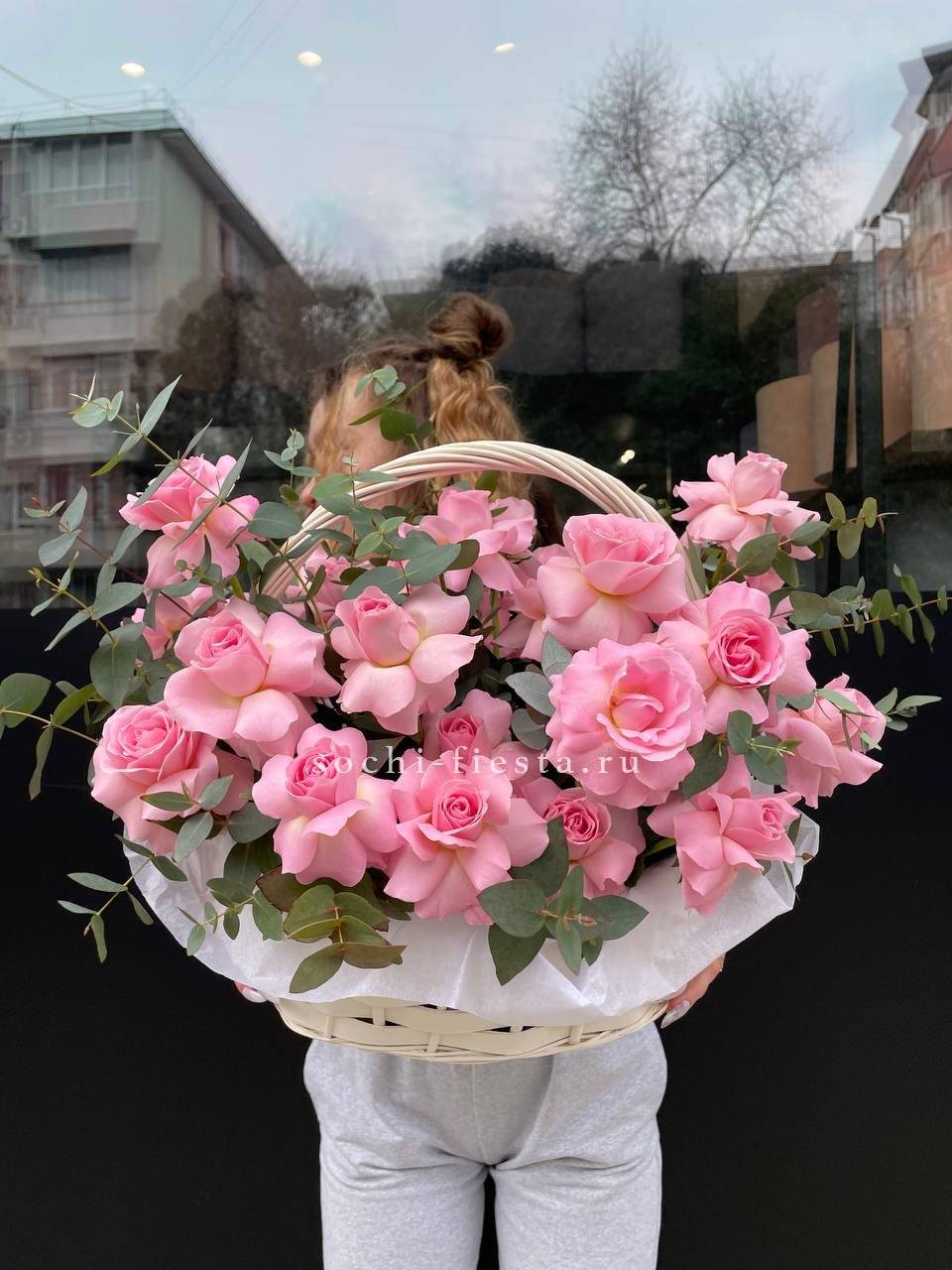 роза розовая (оттенки от нежно-розового до фуксии по наличию) французские - 25шт, эвкалипт, корзина.