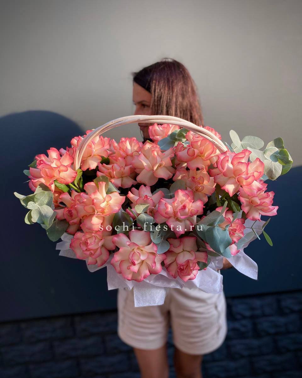 Плотная сферическая форма из пышных бутонов создаёт объёмную композицию в плетёной корзине. Ветки эвкалипта добавляют воздушности между головками цветов. Классическое решение для яркого события или знакового дня в жизни близкого человека.