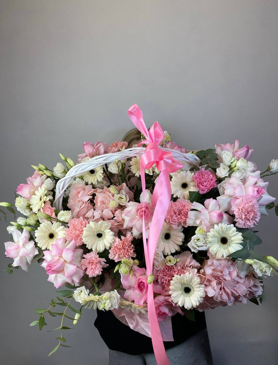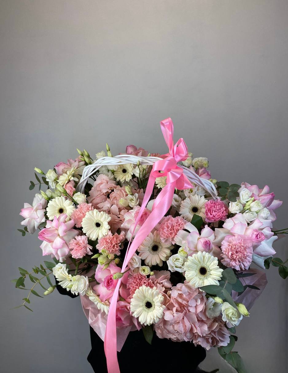Масштабная корзина объединяет лилии, гортензии, антиринум, розы и эустому в единую объёмную композицию. Высота и насыщенность каждого слоя создают впечатление цветочного изобилия.