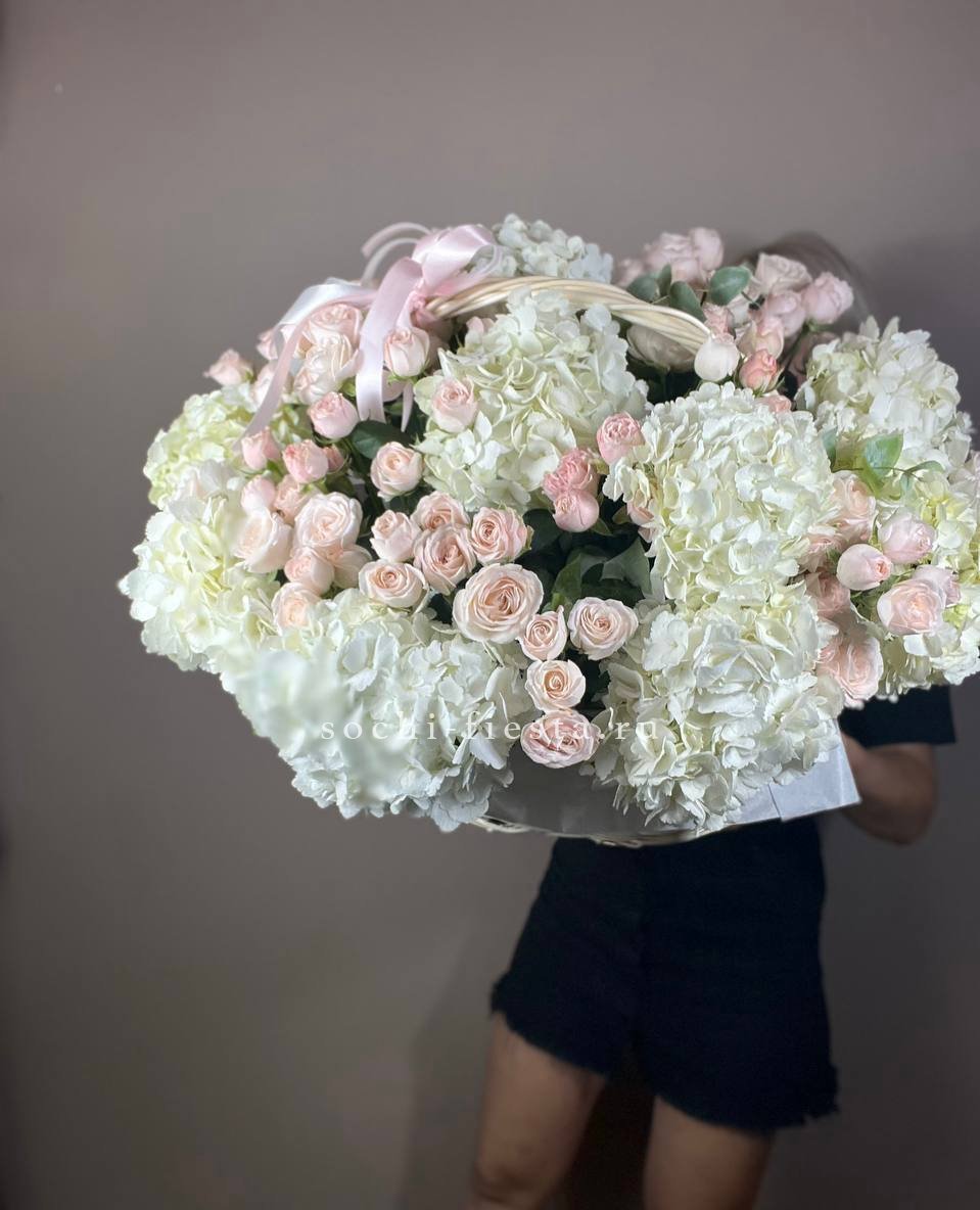 41 пионовидная кустовая роза Misty Bubbles, эвкалипт, светлая корзина.