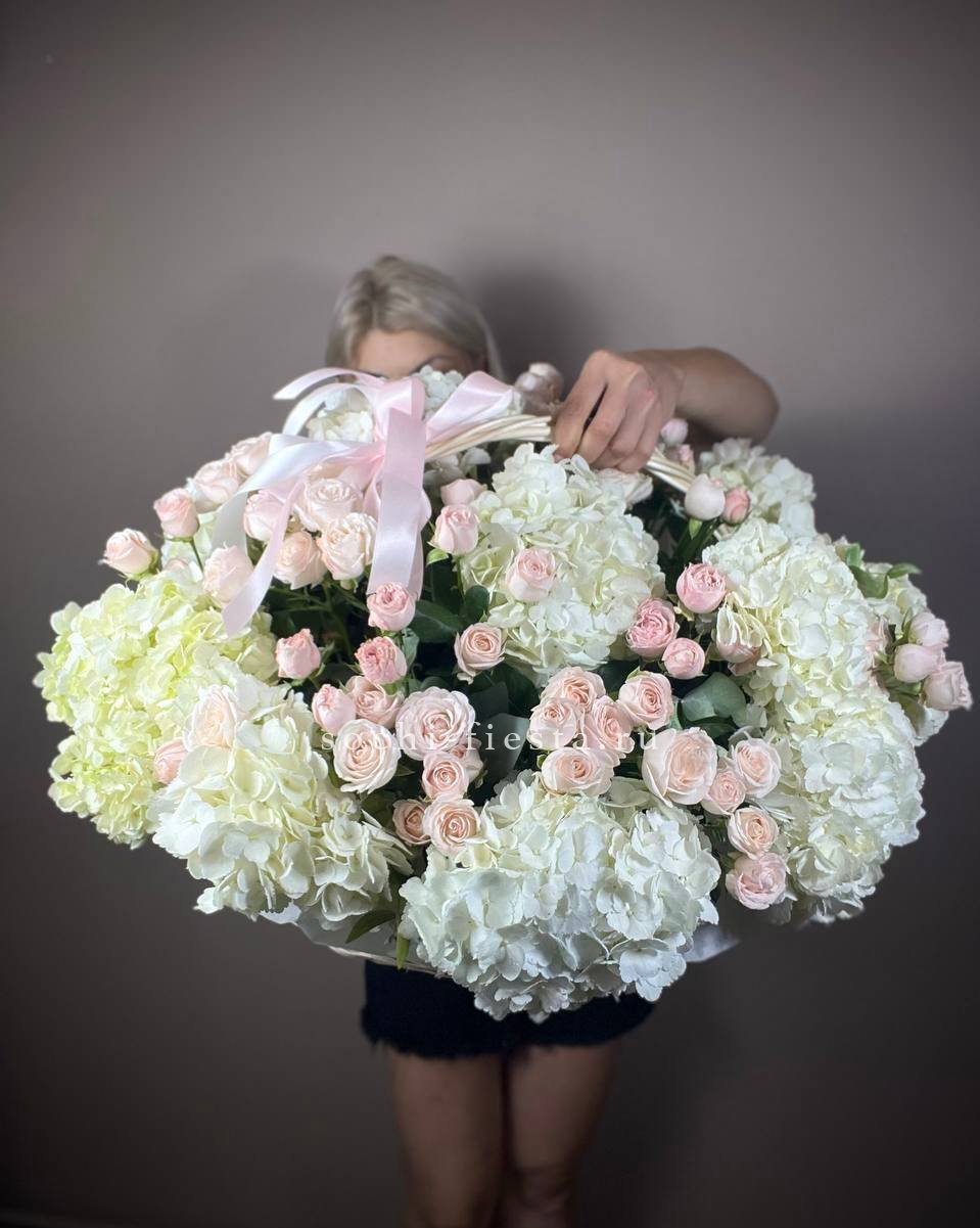 Сорок одна пионовидная роза в светлой корзине выстраивает объёмную композицию с мягкими переливами лилового и розового. Эвкалипт обрамляет густую россыпь бутонов.