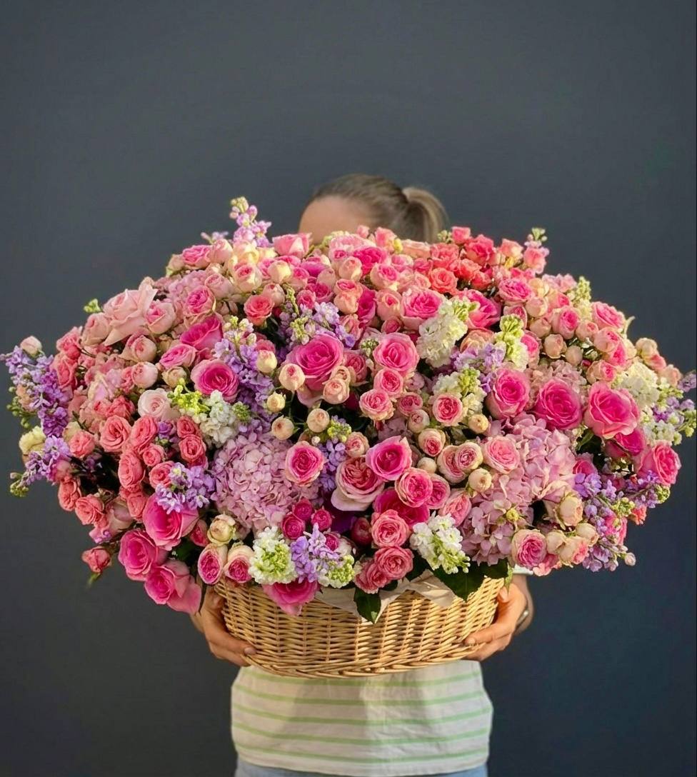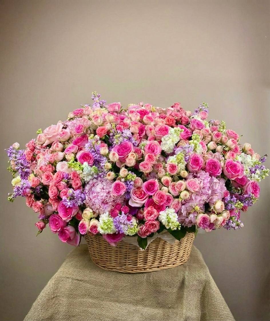 Плотная россыпь кустовых роз и эустомы создает живую текстуру с множеством мелких бутонов. Диантус добавляет воздушности, а эвкалипт собирает композицию в завершенную форму. Корзина позволяет разместить букет на столе без дополнительной вазы.