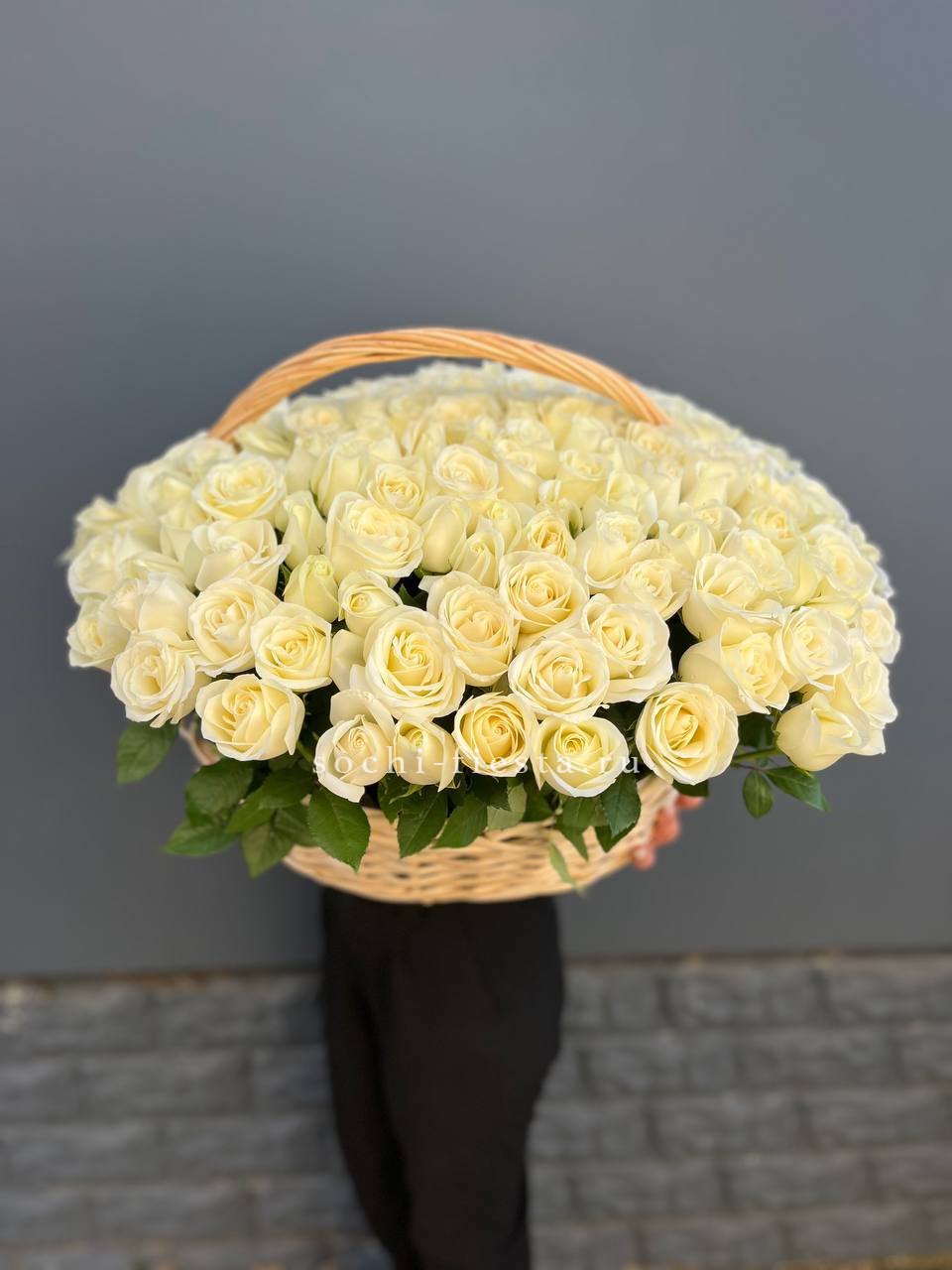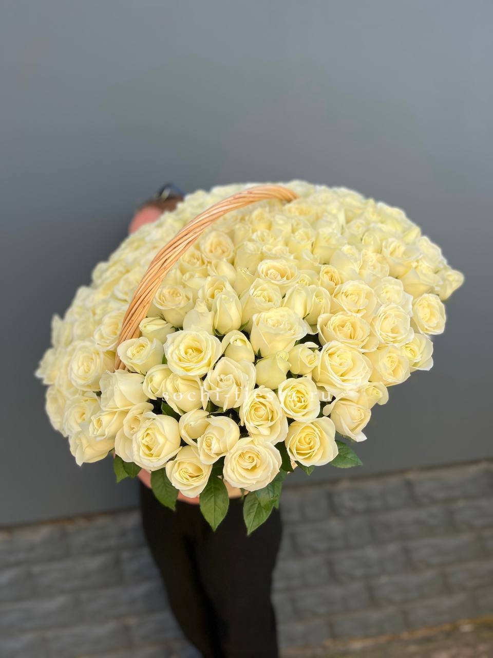 Монументальная композиция из полутора сотен белоснежных бутонов создает впечатление цветочного облака. Корзина придает устойчивость и завершенность форме, позволяя разместить такой масштабный ансамбль в любом пространстве.