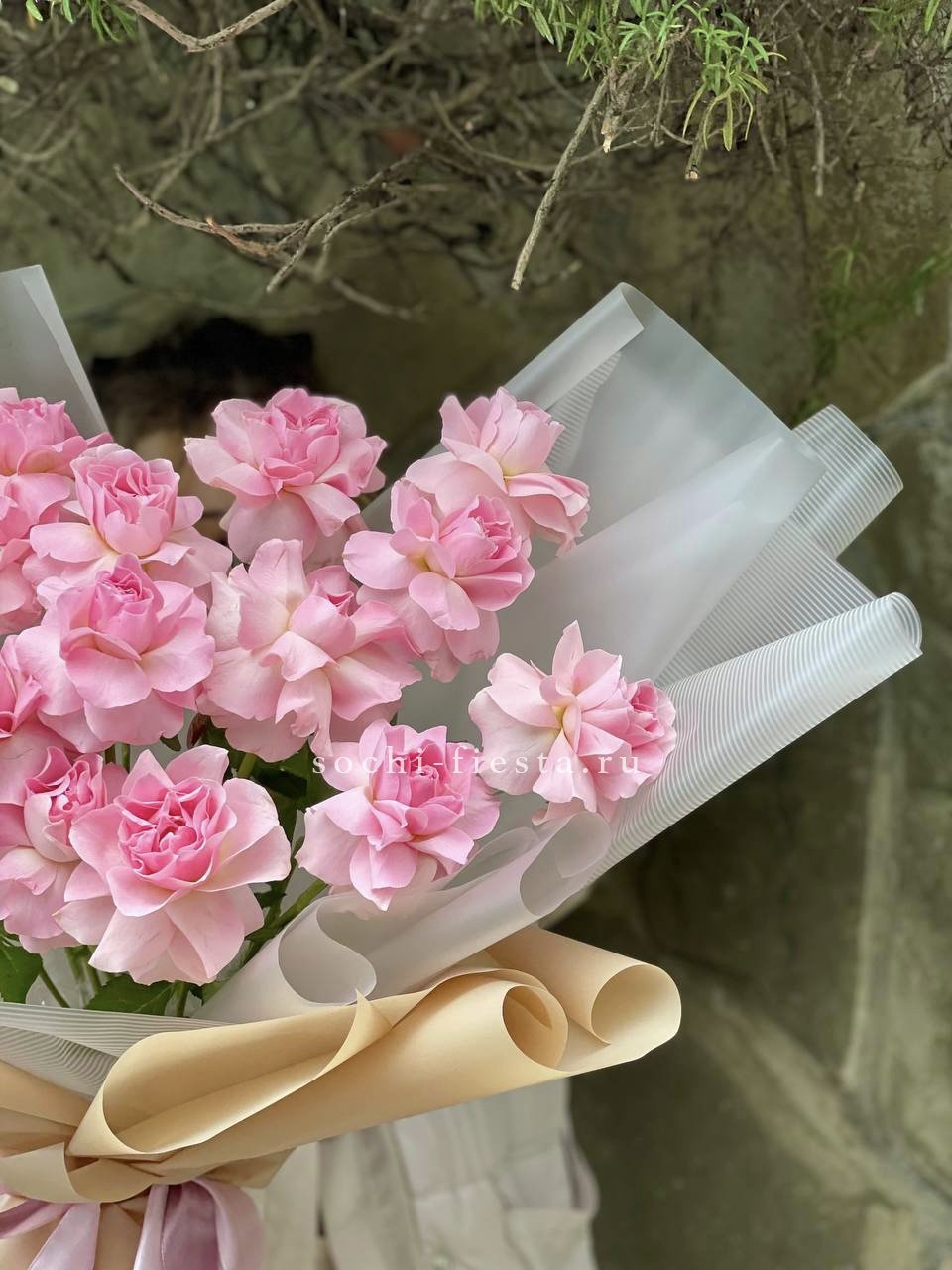 Семь пионовидных роз образуют компактный букет с мягкими линиями и спокойным ритмом. Ветви эвкалипта добавляют воздушности и завершают композицию.