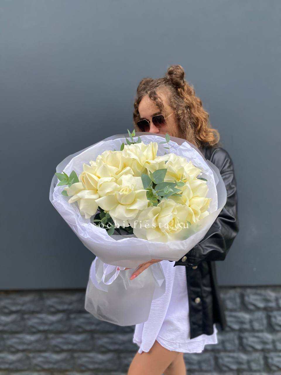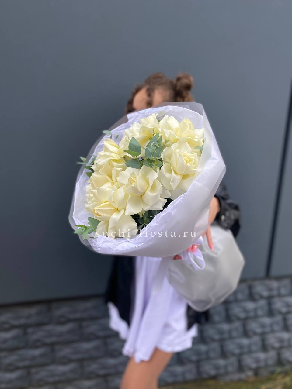 Пятнадцать белых роз собраны в аккуратную сумочку с веточками эвкалипта. Компактная форма позволяет разместить композицию на столе или полке, а матовая зелень добавляет свежести классическому белому цвету.