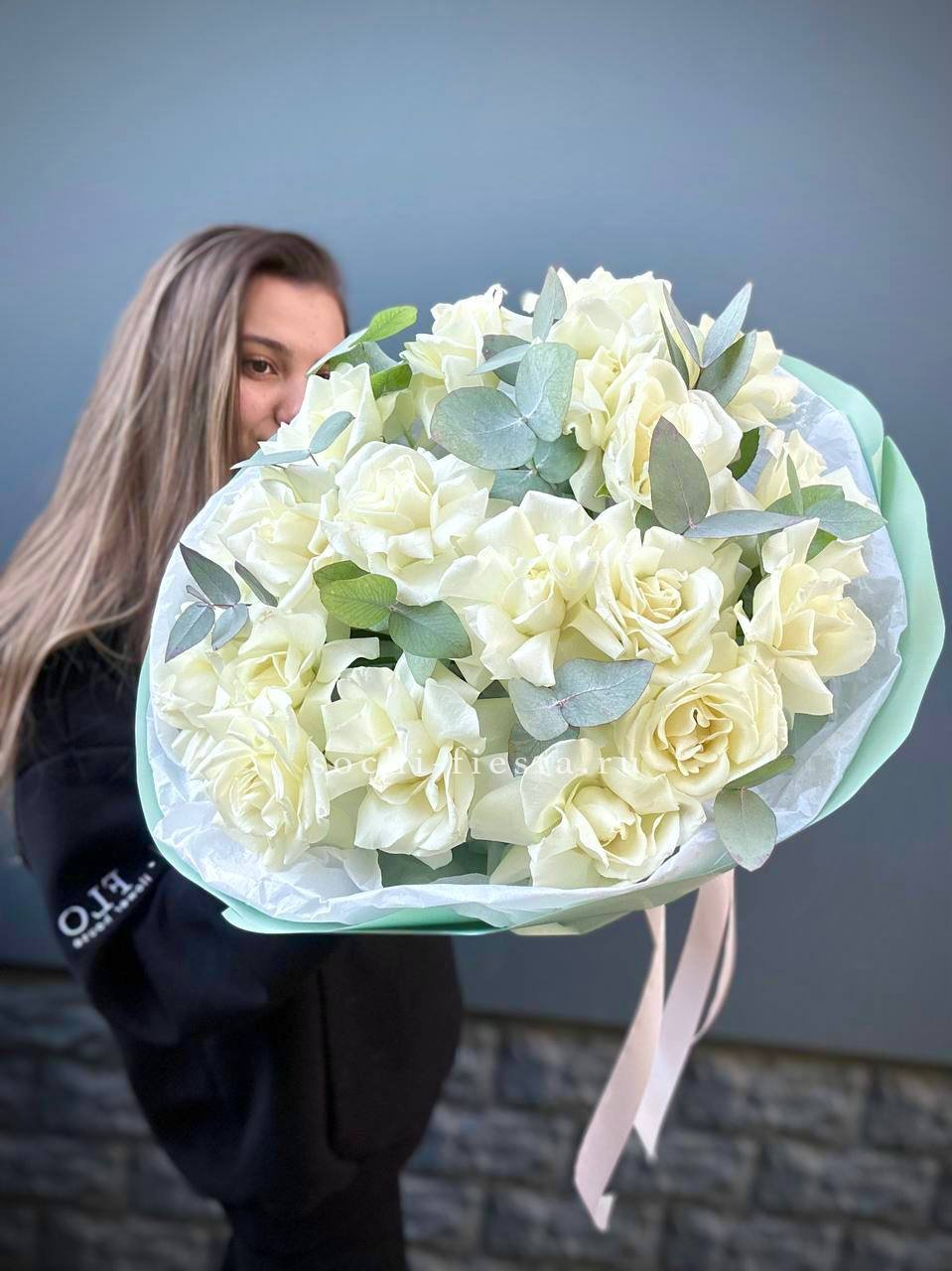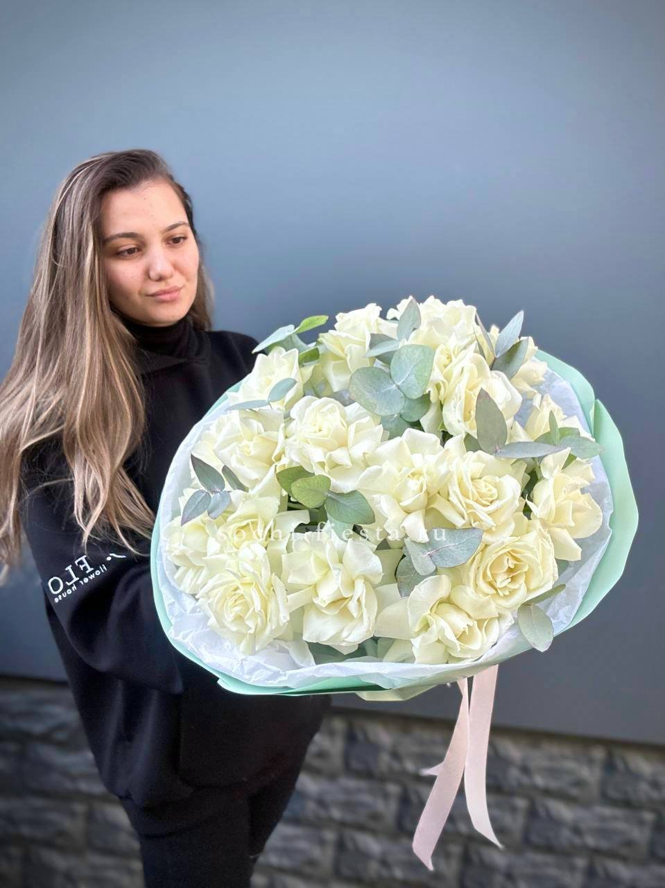 Семь белых бутонов в лаконичной обёртке. Компактная форма и чистота линий делают букет удобным для любого интерьера.