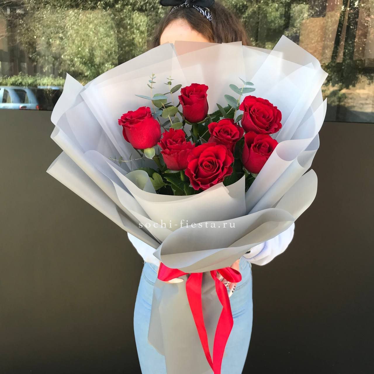 17 красных роз, лента, крафт или дизайнерская пленка.